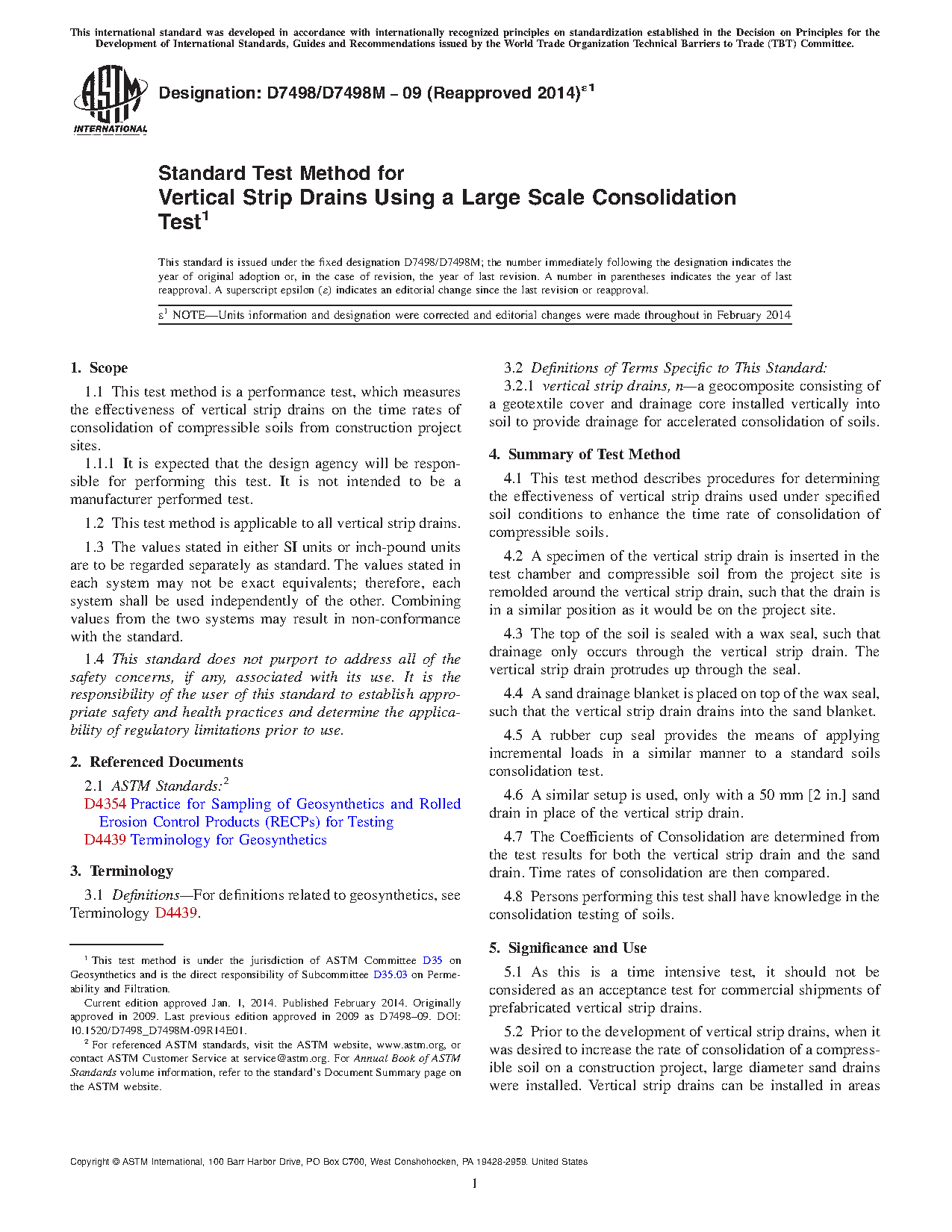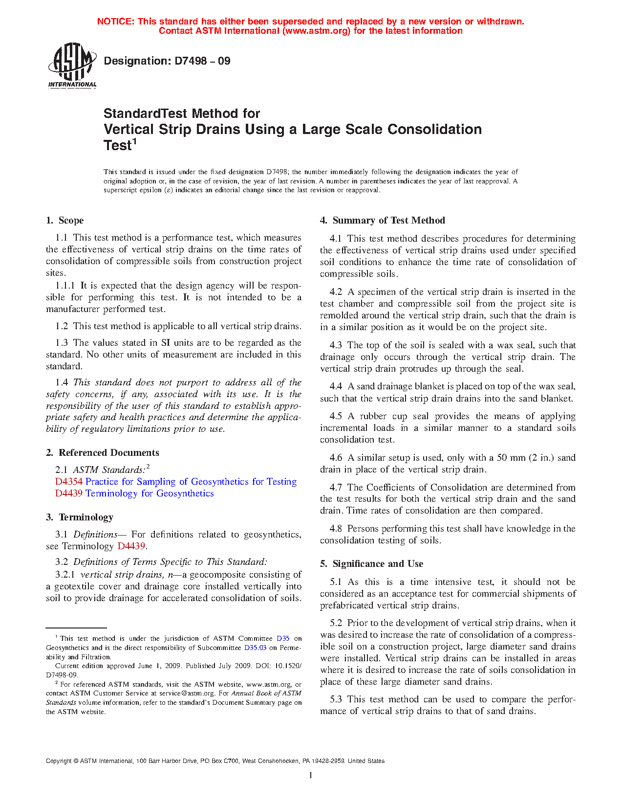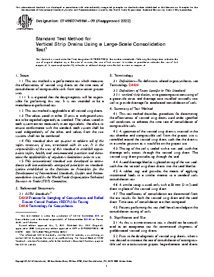 1.1 This test method is a performance test, which measures the effectiveness of vertical strip drains on the time rates of consolidation of compressible soils from construction project sites.