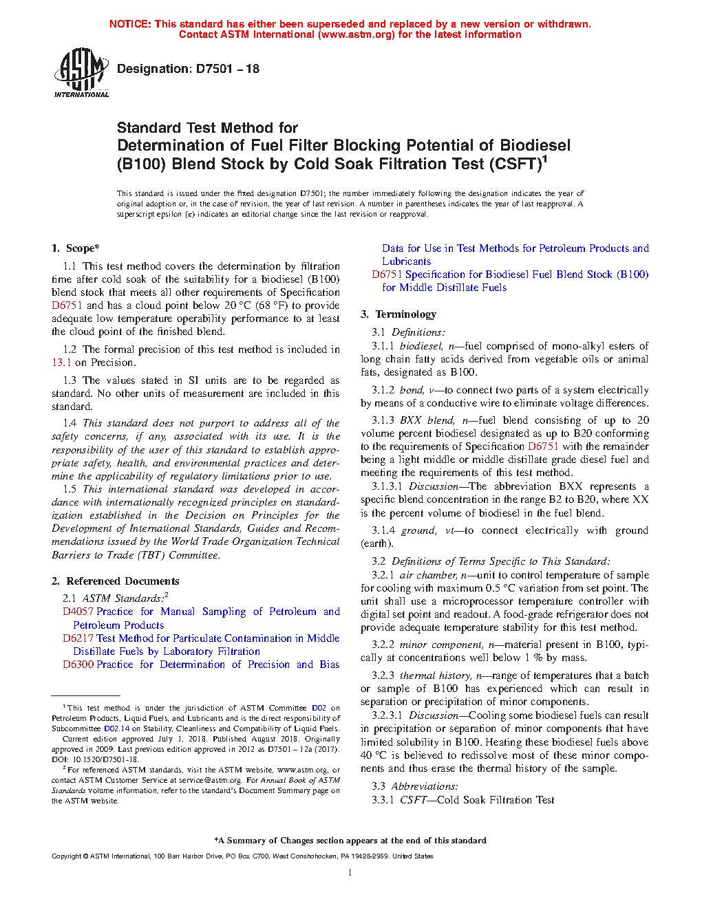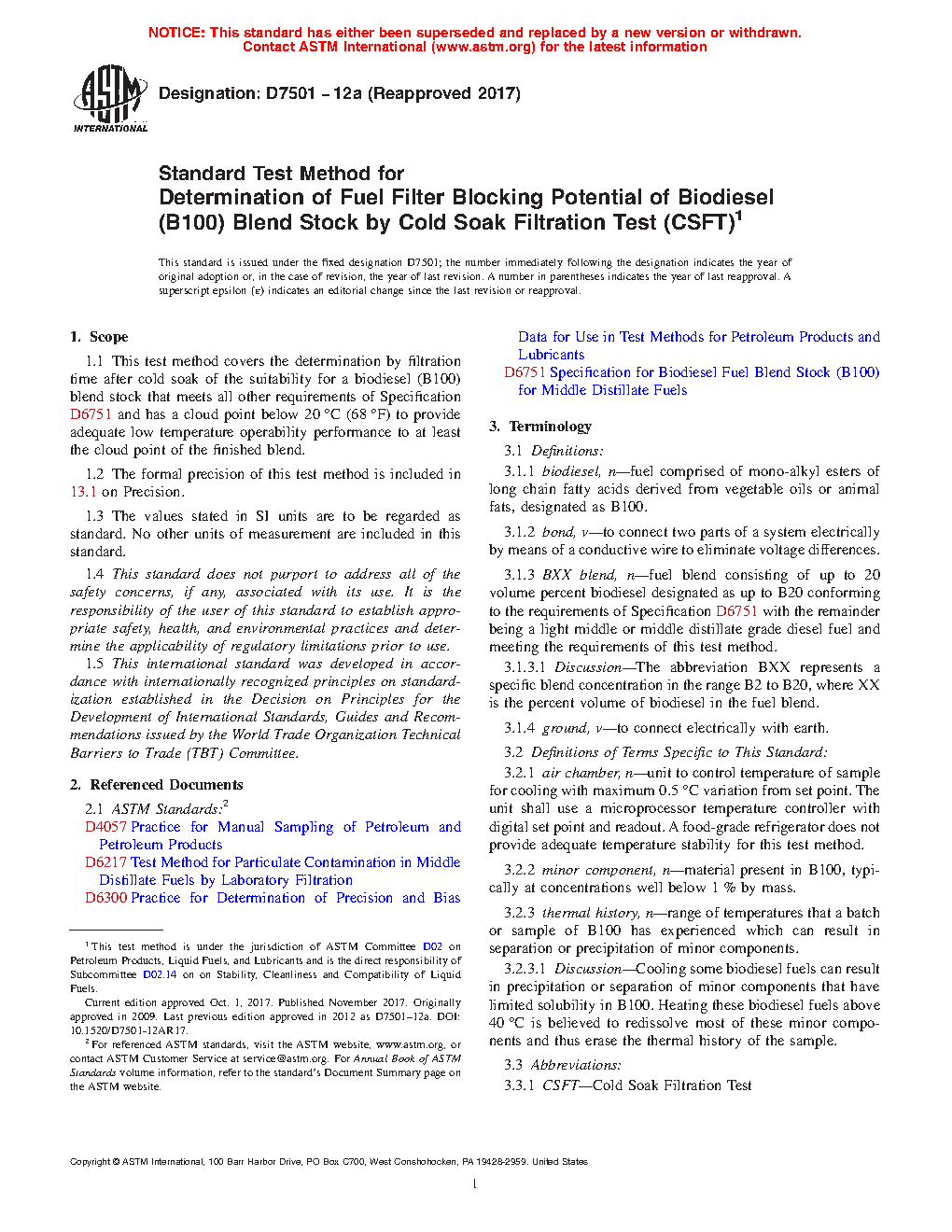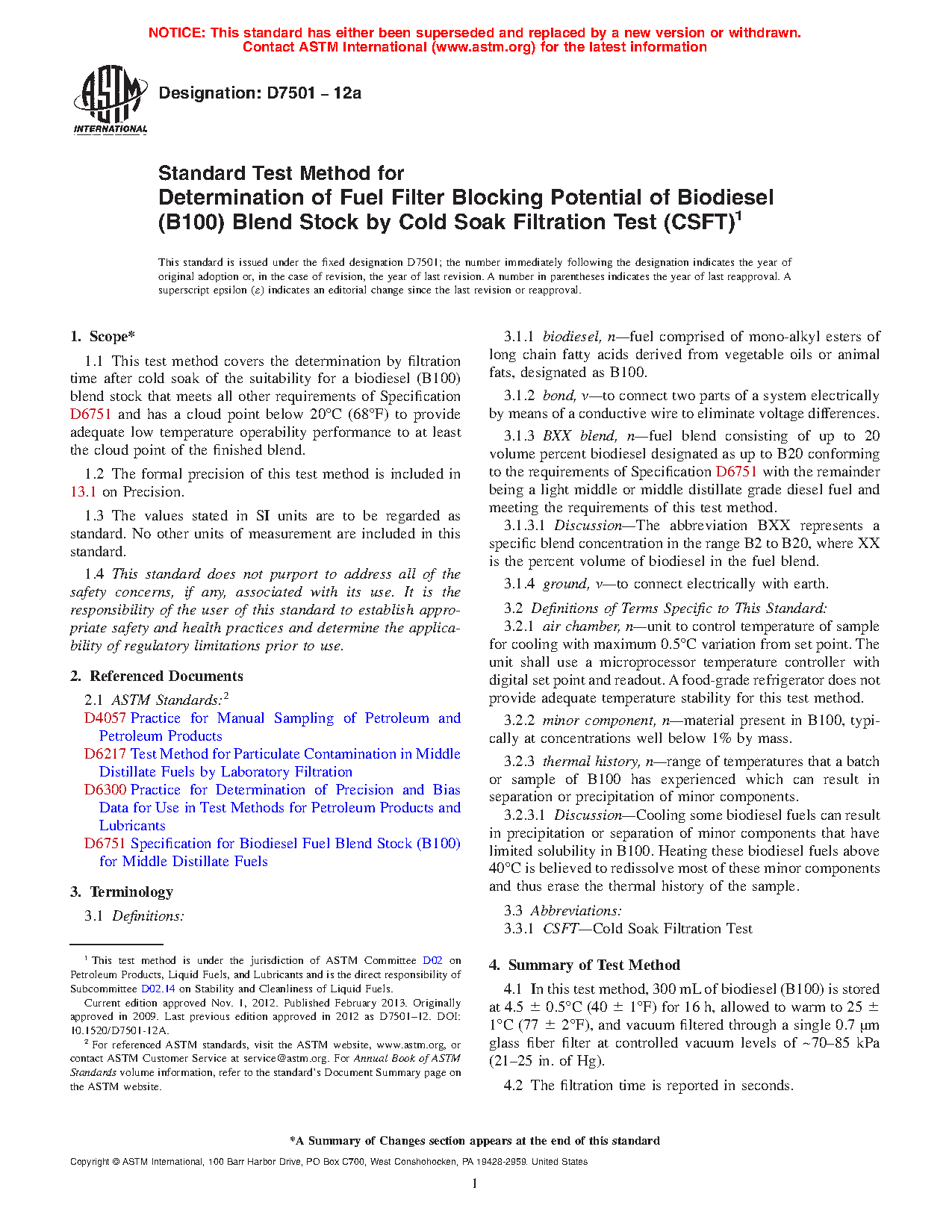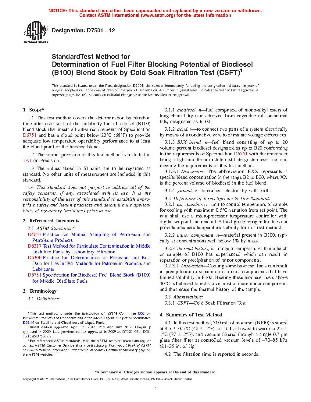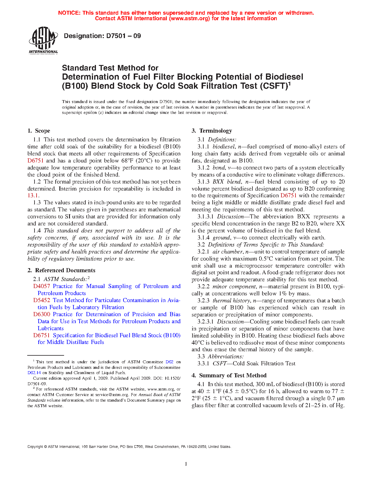 1.1 This test method covers the determination by filtration time after cold soak of the suitability for a biodiesel (B100) blend stock that meets all other requirements of Specification D6751 and has a cloud point below 20 °C (68 °F) to provide adequate low temperature operability performance to at least the cloud point of the finished blend.