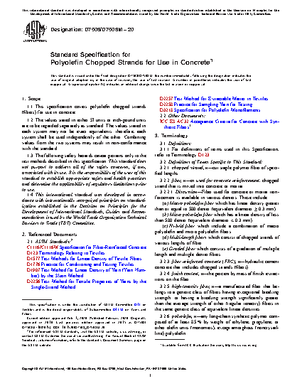 1.1 This specification covers polyolefin chopped strands (fibers) for use in concrete.