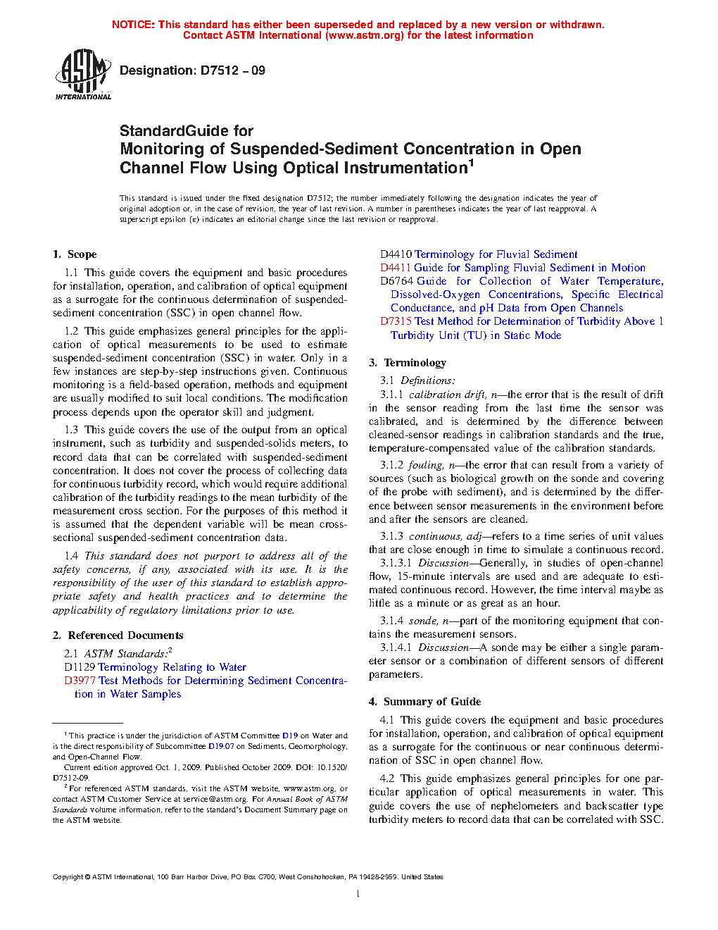 1.1 This guide covers the equipment and basic procedures for installation, operation, and calibration of optical equipment as a surrogate for the continuous determination of suspended-sediment concentration (SSC) in open channel flow.