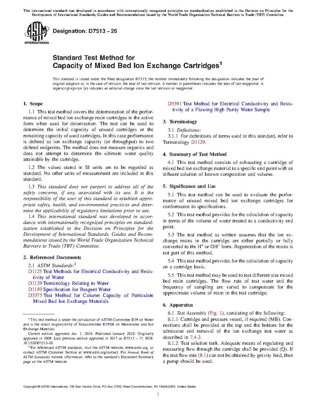 This test method provides for the calculation of capacity in terms of the volume of water treated to a conductivity end point.