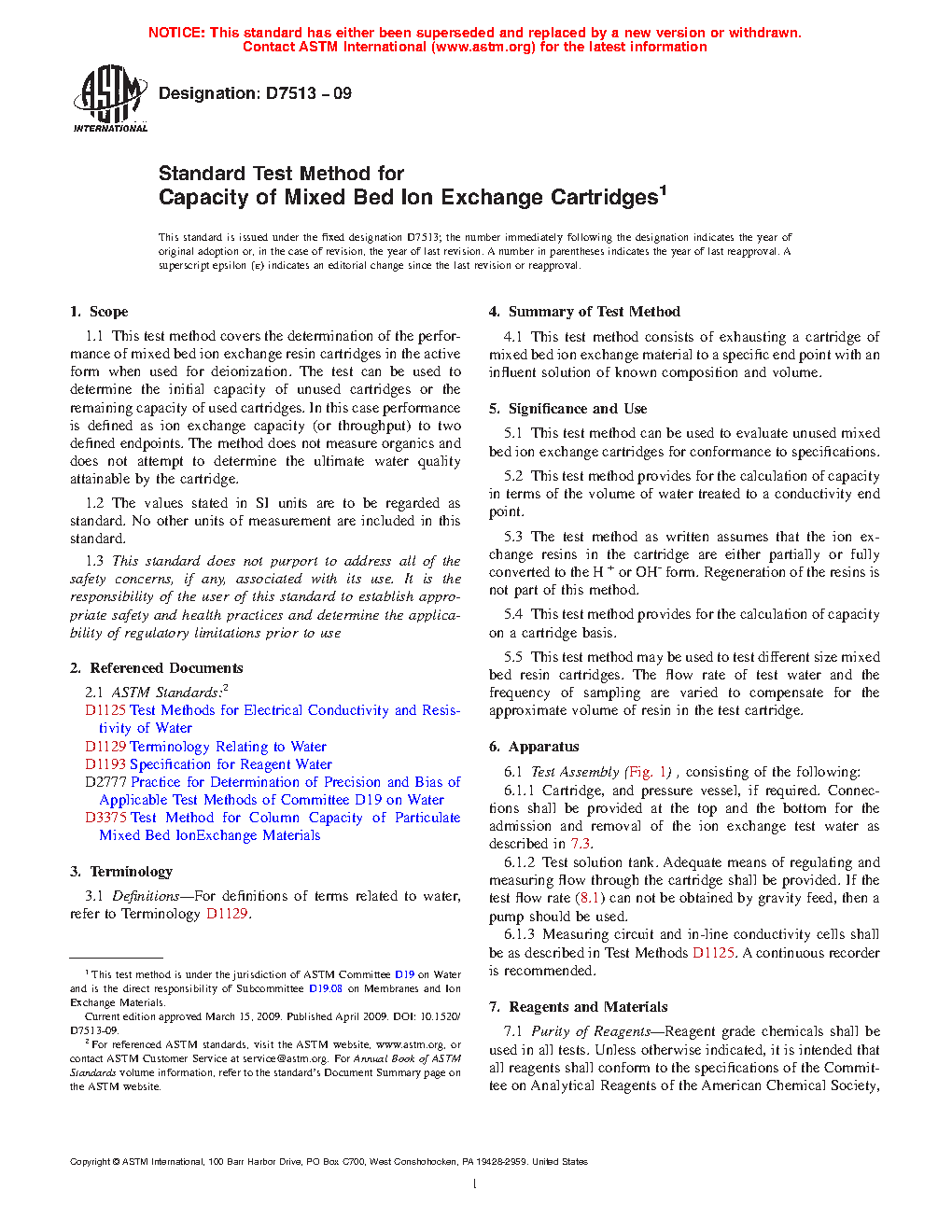 This test method can be used to evaluate unused mixed bed ion exchange cartridges for conformance to specifications.
