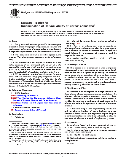 1.1 This practice will provide a protocol for determining the effect of extended drying (open time) periods on the shear and peel strength performance of a carpet adhesive when bonding a carpet backing or standard duck cloth material to a substrate.