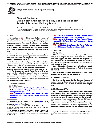 5.2 This practice is particularly useful for testing the drying rate of waterborne pavement marking (traffic) paints where fast dry at elevated ambient humidity is an important feature. For waterborne traffic paints, the test chamber can be used to evaluate dry to no-pick-up (Test Method D711) and water wash-off resistance (Practices D7377 and D7538) at elevated ambient humidity.