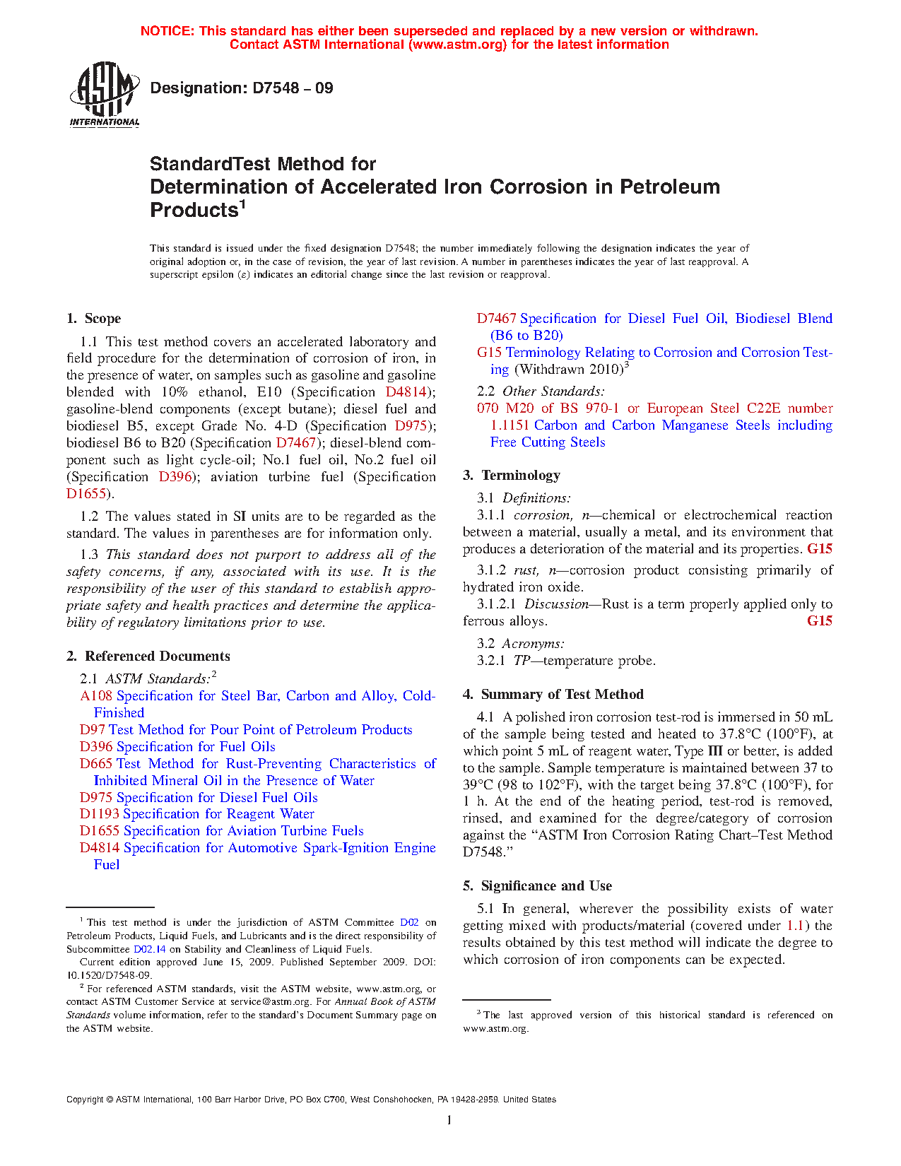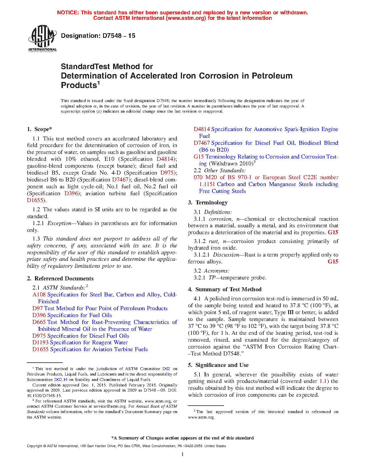 1.1 This test method covers an accelerated laboratory and field procedure for the determination of corrosion of iron, in the presence of water, on samples such as gasoline and gasoline blended with 10 % ethanol, E10 (Specification D4814); gasoline-blend components (except butane); diesel fuel and biodiesel B5, except Grade No. 4-D (Specification D975); biodiesel B6 to B20 (Specification D7467); diesel-blend component such as light cycle-oil; No.1 fuel oil, No.2 fuel oil (Specification D396); aviation turbine fuel (Specification D1655).