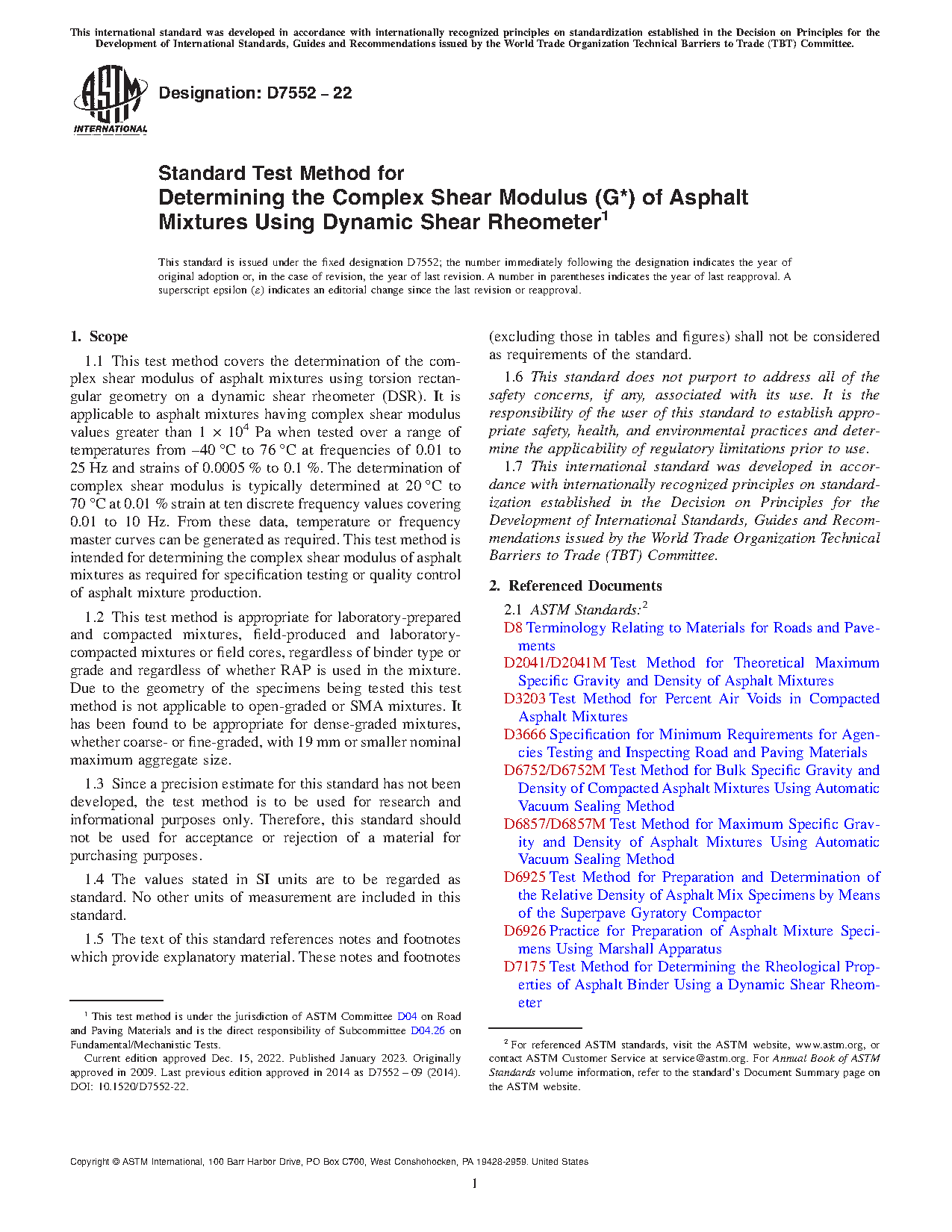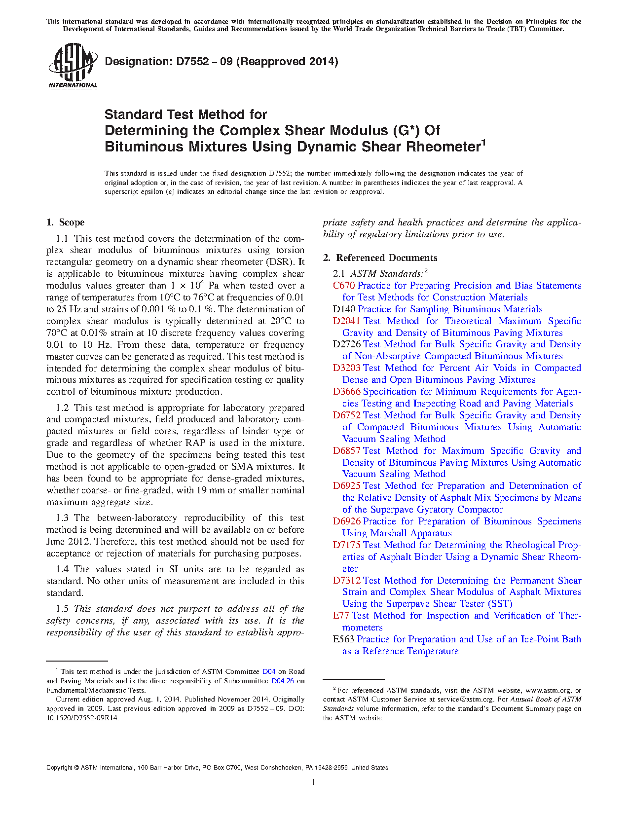 1.1 This test method covers the determination of the complex shear modulus of bituminous mixtures using torsion rectangular geometry on a dynamic shear rheometer (DSR). It is applicable to bituminous mixtures having complex shear modulus values greater than 1 × 104 Pa when tested over a range of temperatures from 10°C to 76°C at frequencies of 0.01 to 25 Hz and strains of 0.001 % to 0.1 %. The determination of complex shear modulus is typically determined at 20°C to 70°C at 0.01% strain at 10 discrete frequency values covering 0.01 to 10 Hz. From these data, temperature or frequency master curves can be generated as required. This test method is intended for determining the complex shear modulus of bituminous mixtures as required for specification testing or quality control of bituminous mixture production.