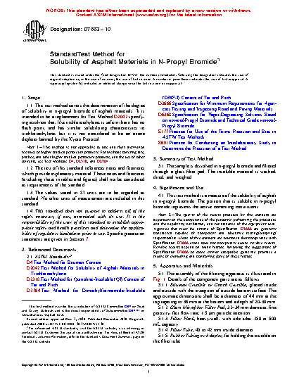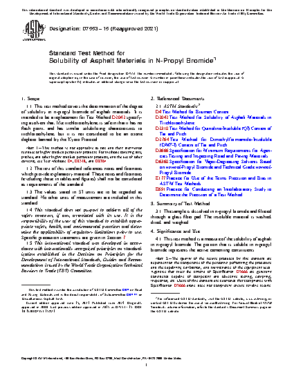 1.1 This test method covers the determination of the degree of solubility in n-propyl bromide of asphalt materials. It is intended to be a replacement for Test Method D2042 specifying a solvent that, like trichloroethylene, is safe in that it has no flash point, and has similar solubilizing characteristics to trichloroethylene, but it is not considered to be an ozone depleter banned by the Kyoto Protocol.