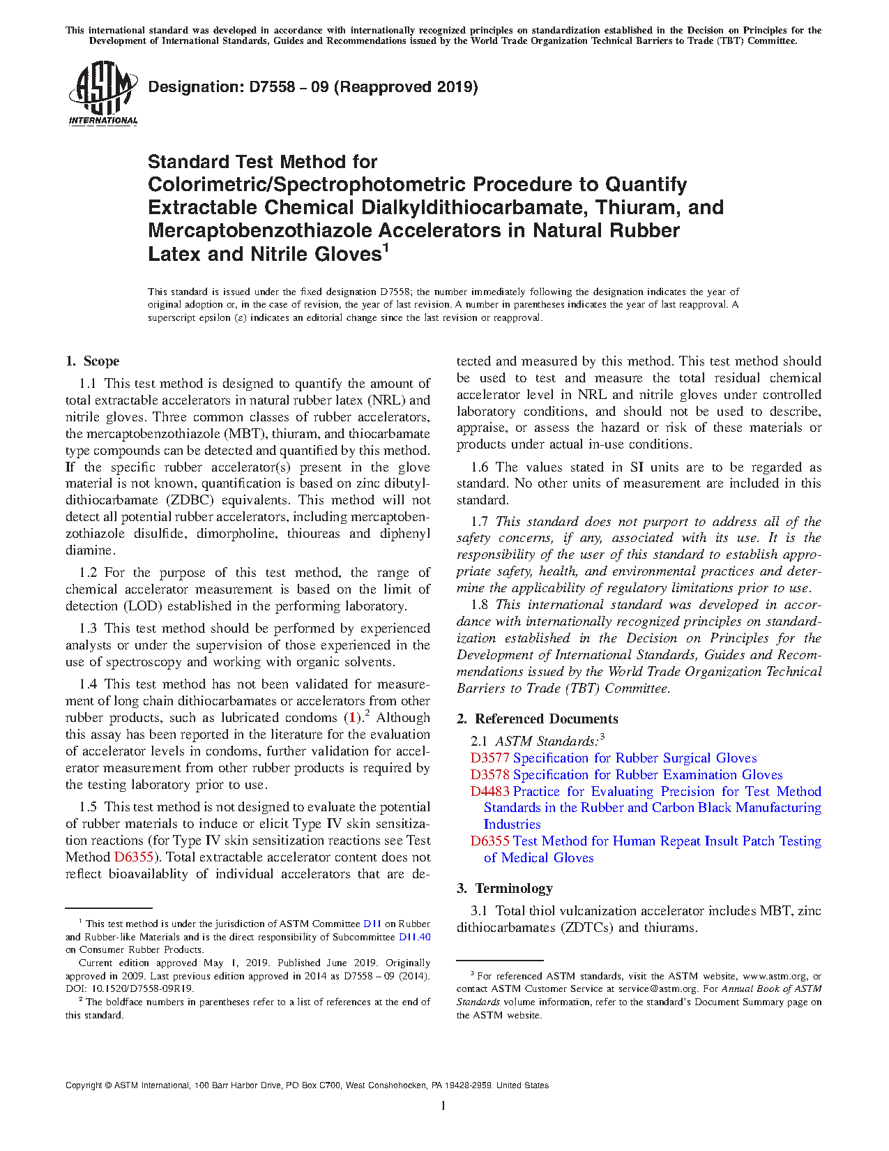 1.4 This test method has not been validated for measurement of long chain dithiocarbamates or accelerators from other rubber products, such as lubricated condoms (1). Although this assay has been reported in the literature for the evaluation of accelerator levels in condoms, further validation for accelerator measurement from other rubber products is required by the testing laboratory prior to use.