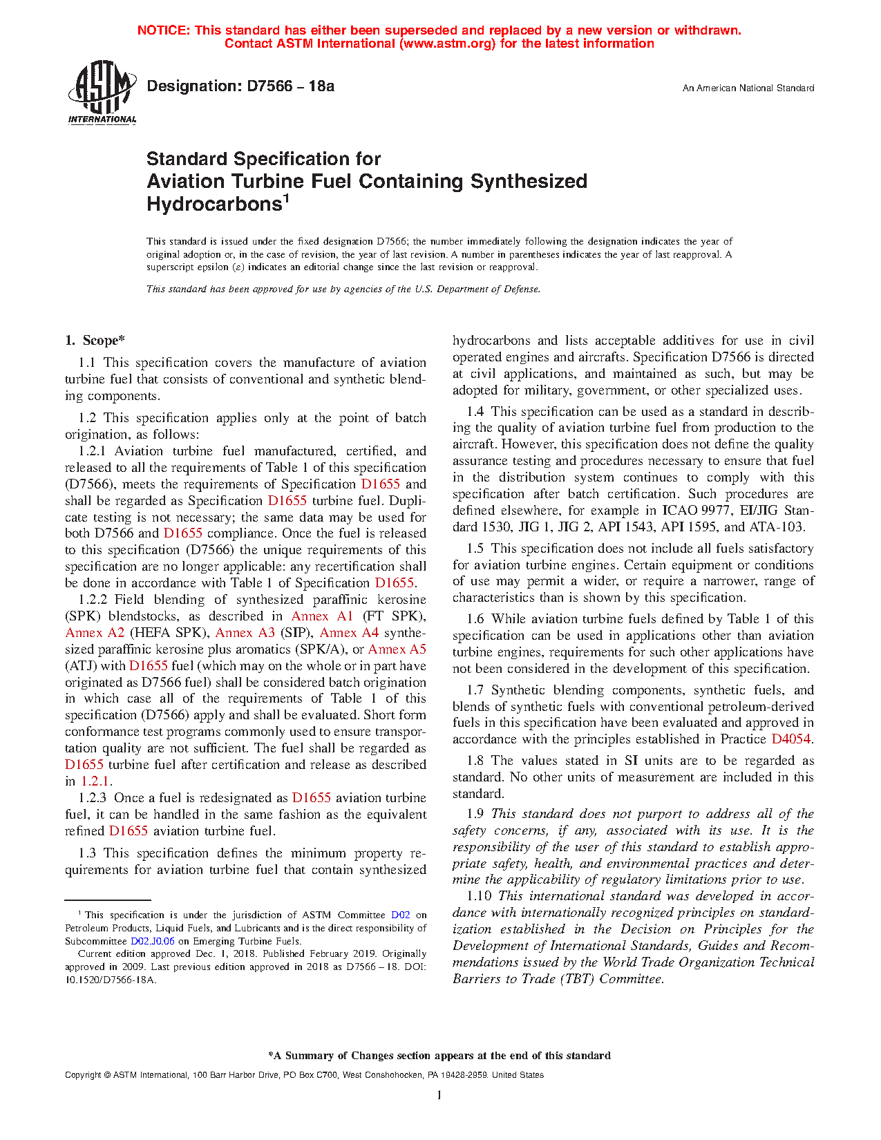 1.3.1 Aviation turbine fuel manufactured, certified, and released to all the requirements of Table 1 of this specification (D7566), meets the requirements of Specification D1655 and shall be regarded as Specification D1655 turbine fuel. Duplicate testing is not necessary; the same data may be used for both D7566 and D1655 compliance. Once the fuel is released to this specification (D7566) the unique requirements of this specification are no longer applicable: any recertification shall be done in accordance with Table 1 of Specification D1655.