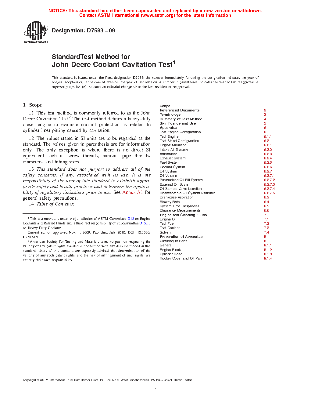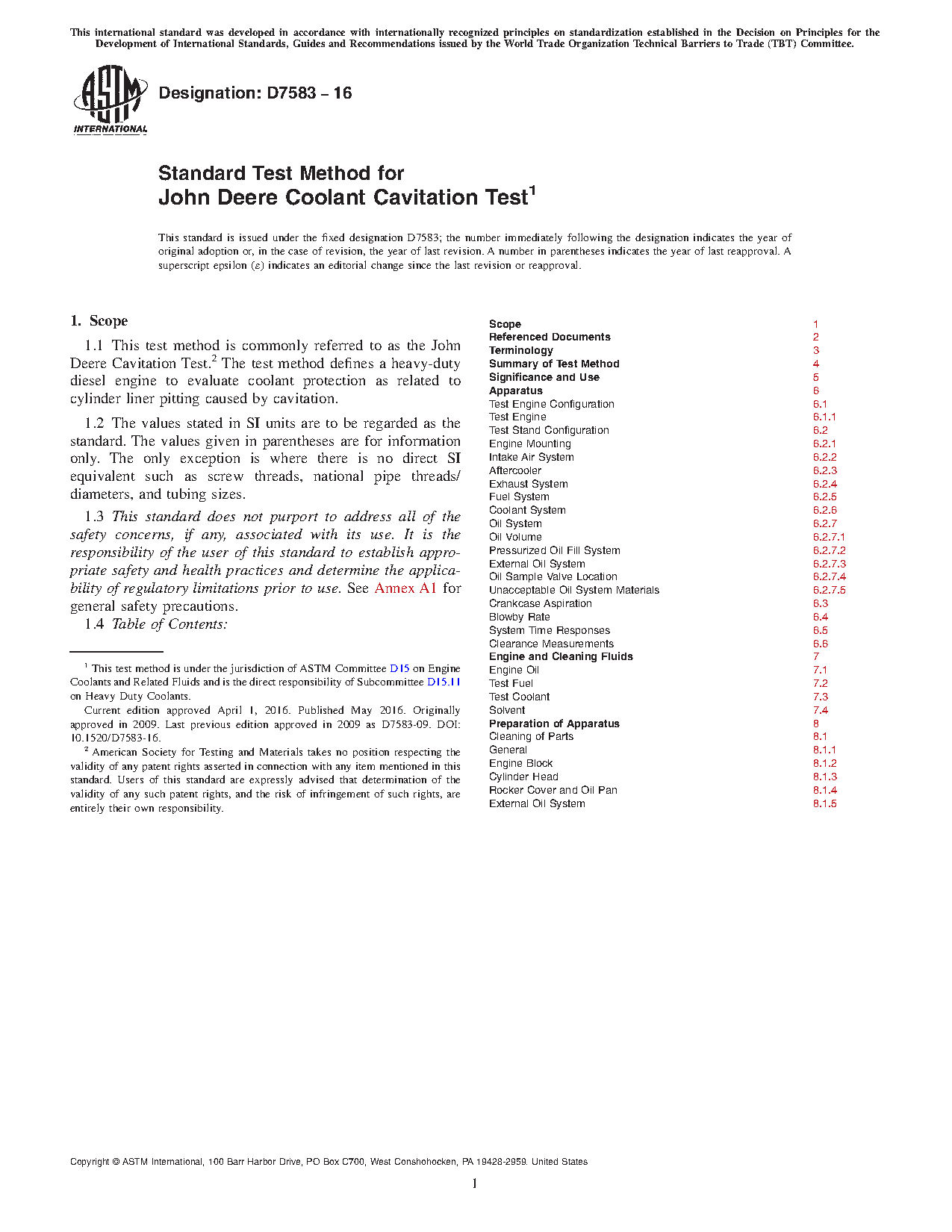 1.1 This test method is commonly referred to as the John Deere Cavitation Test.2 The test method defines a heavy-duty diesel engine to evaluate coolant protection as related to cylinder liner pitting caused by cavitation.