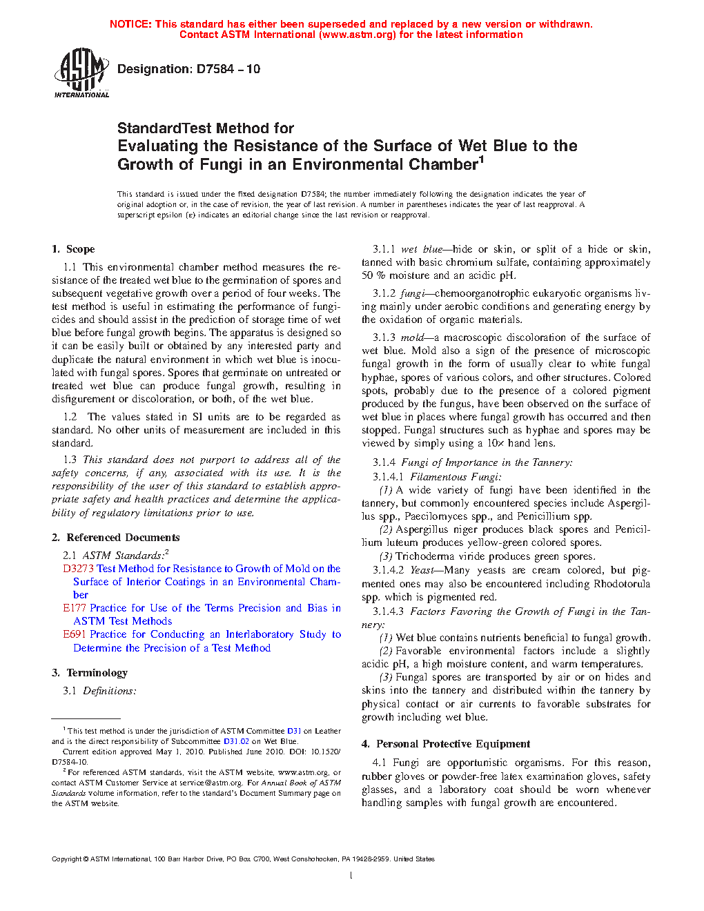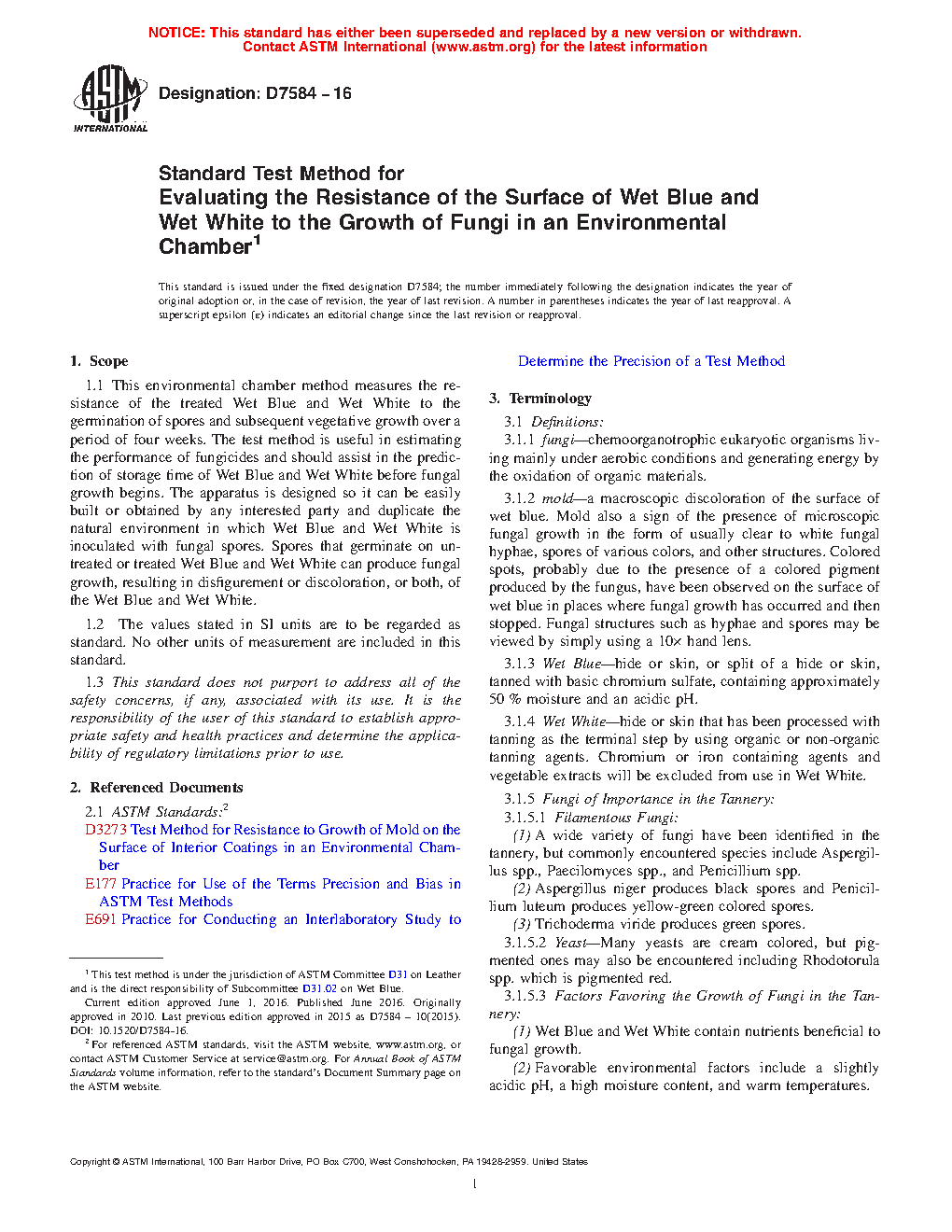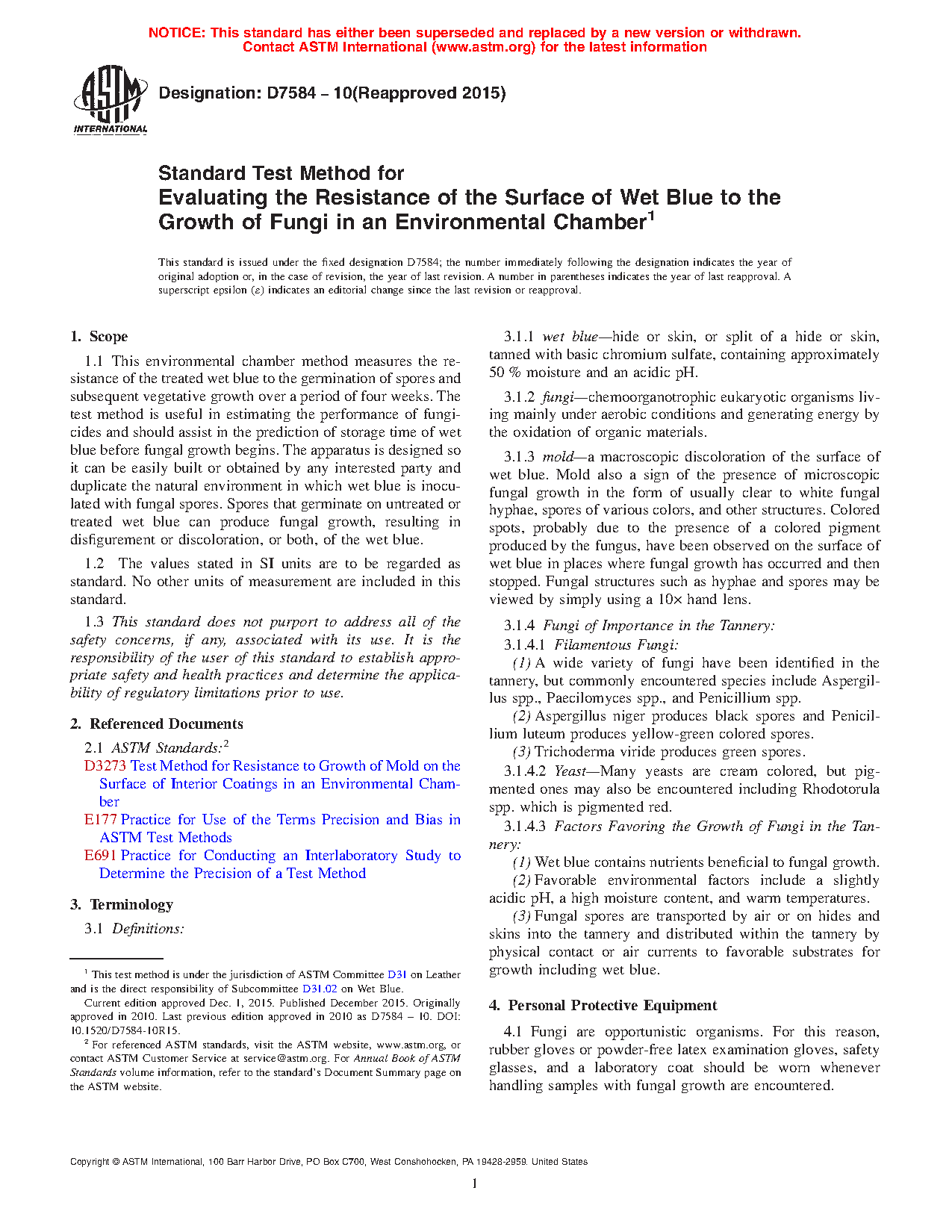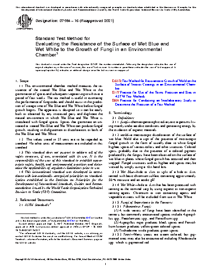 6.1 The environmental chamber method is an accelerated test for determining the resistance of Wet Blue and Wet White to the growth of fungi, the causal agent of mold. See Test Method D3273.3,4