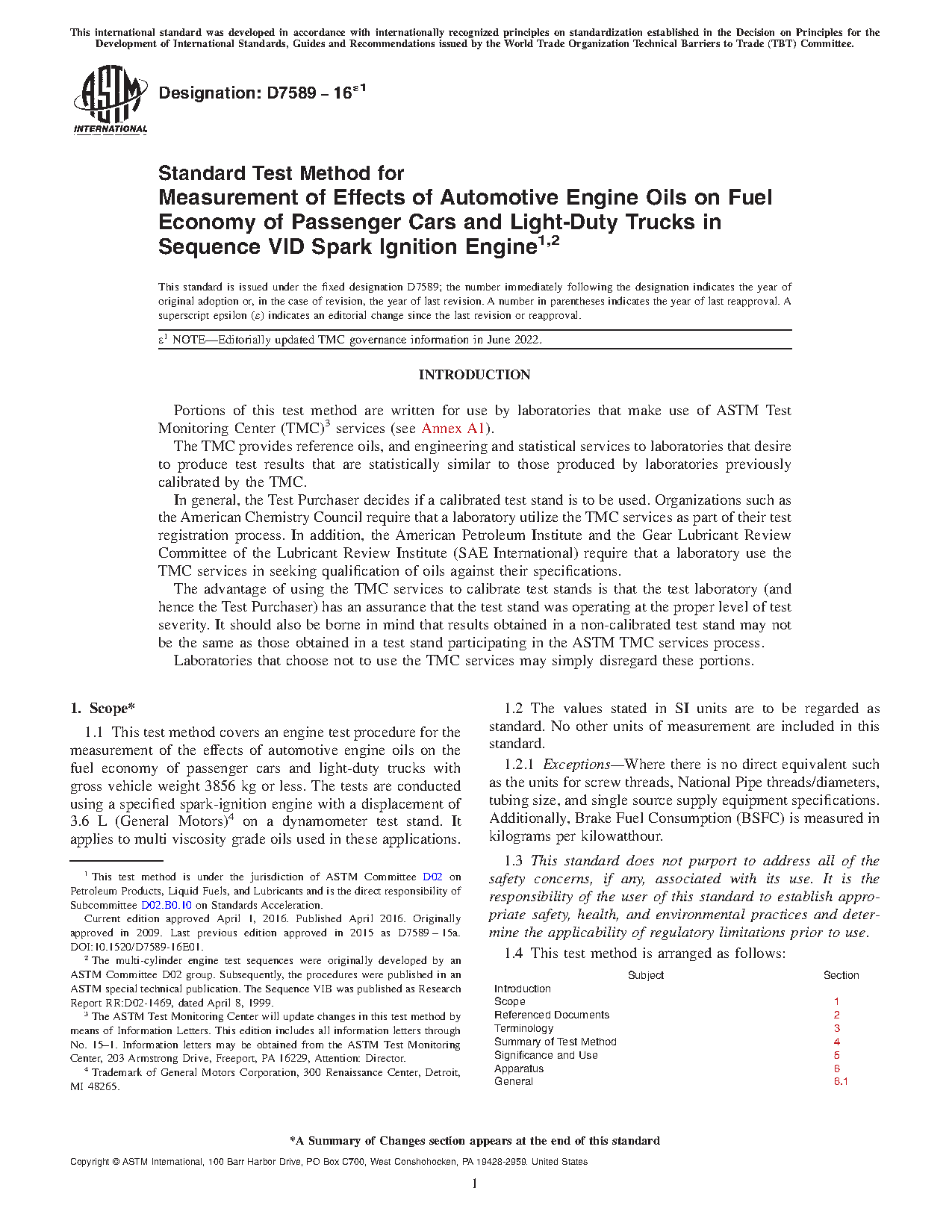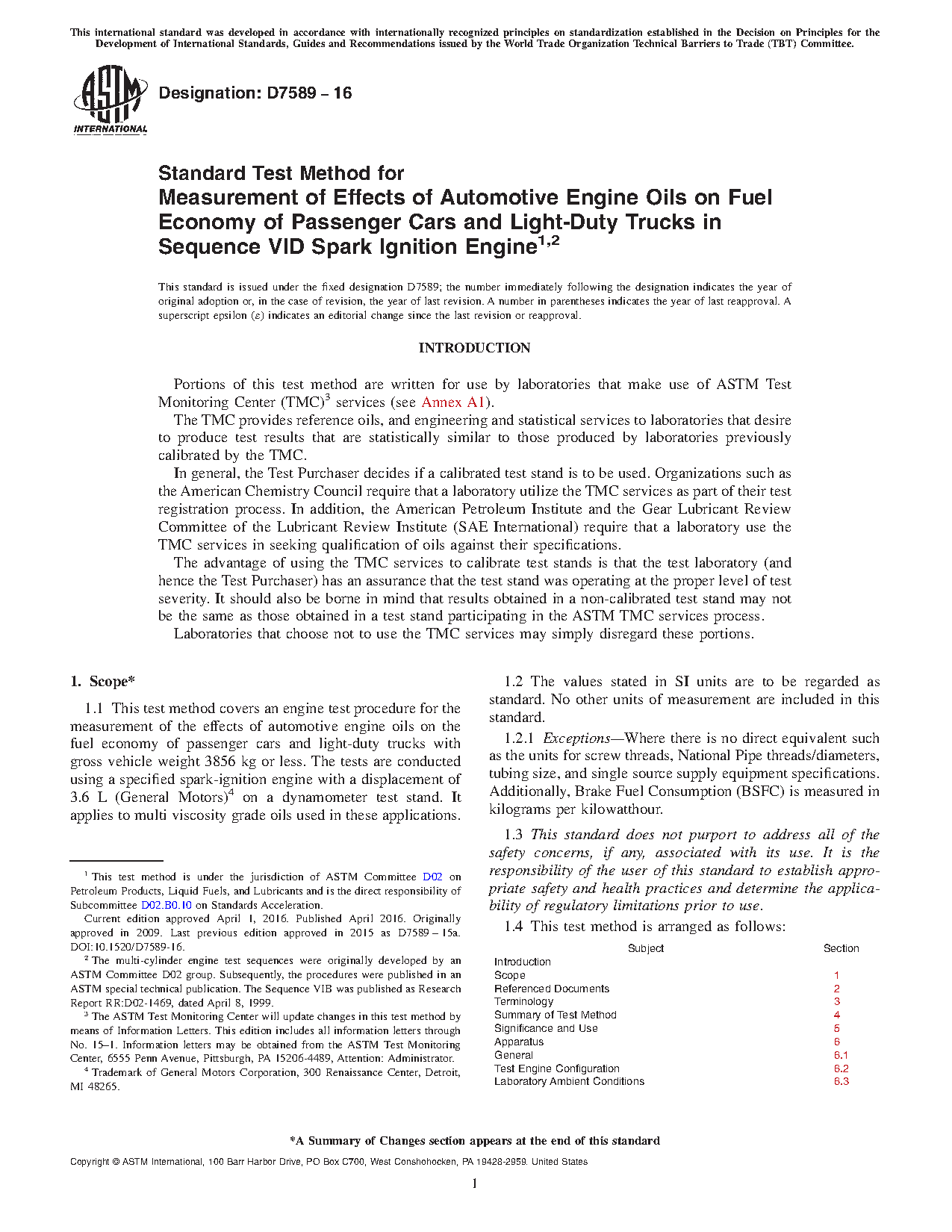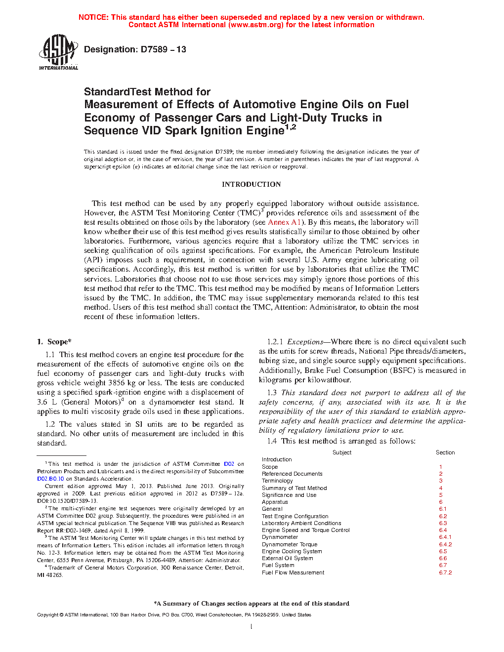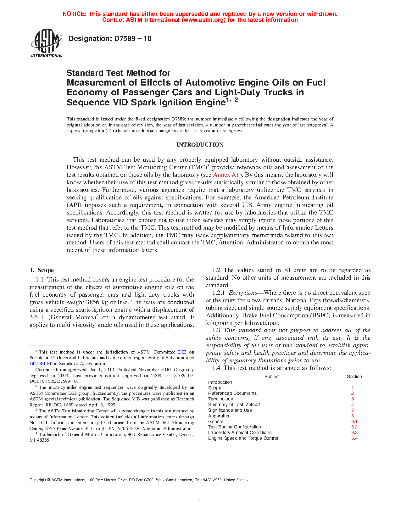 Use—The Sequence VID test method is useful for engine oil fuel economy specification acceptance. It is used in specifications and classifications of engine lubricating oils, such as the following: