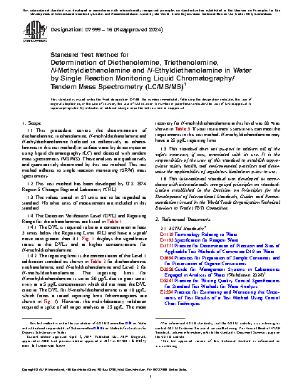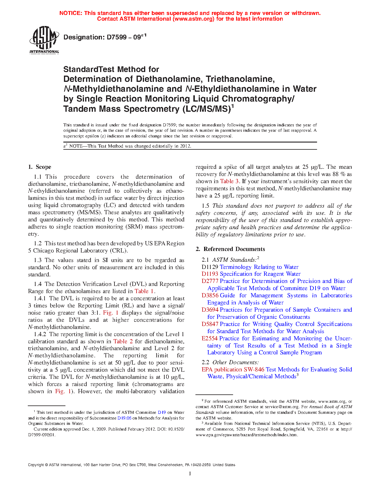 1.1 This procedure covers the determination of diethanolamine, triethanolamine, N-methyldiethanolamine and N-ethyldiethanolamine (referred to collectively as ethanolamines in this test method) in surface water by direct injection using liquid chromatography (LC) and detected with tandem mass spectrometry (MS/MS). These analytes are qualitatively and quantitatively determined by this method. This method adheres to single reaction monitoring (SRM) mass spectrometry.