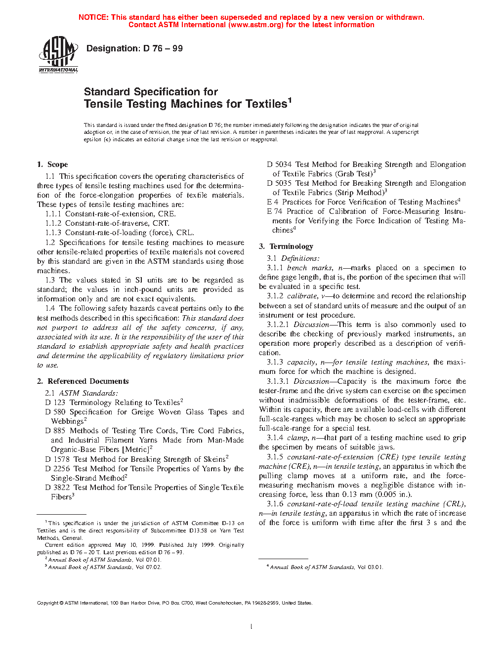 1.1 This specification covers the operating characteristics of three types of tensile testing machines used for the determination of the force-elongation properties of textile materials. These types of tensile testing machines are: