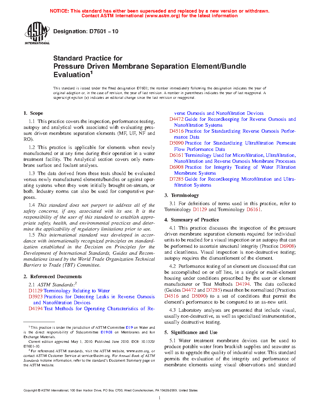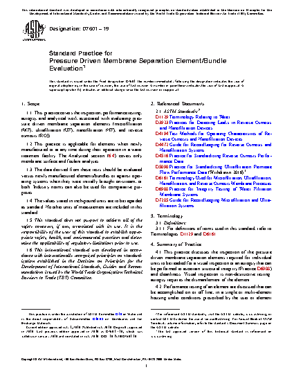 1.2 This practice is applicable for elements when newly manufactured or at any time during their operation in a water treatment facility. The Analytical section (6.4) covers only membrane surface and foulant analyses.