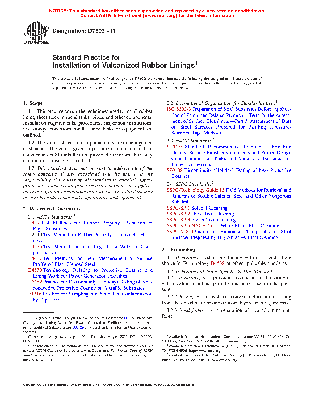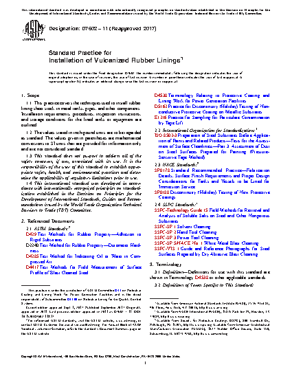 1.1 This practice covers the techniques used to install rubber lining sheet stock in metal tanks, pipes, and other components. Installation requirements, procedures, inspection instructions, and storage conditions for the lined tanks or equipment are outlined.