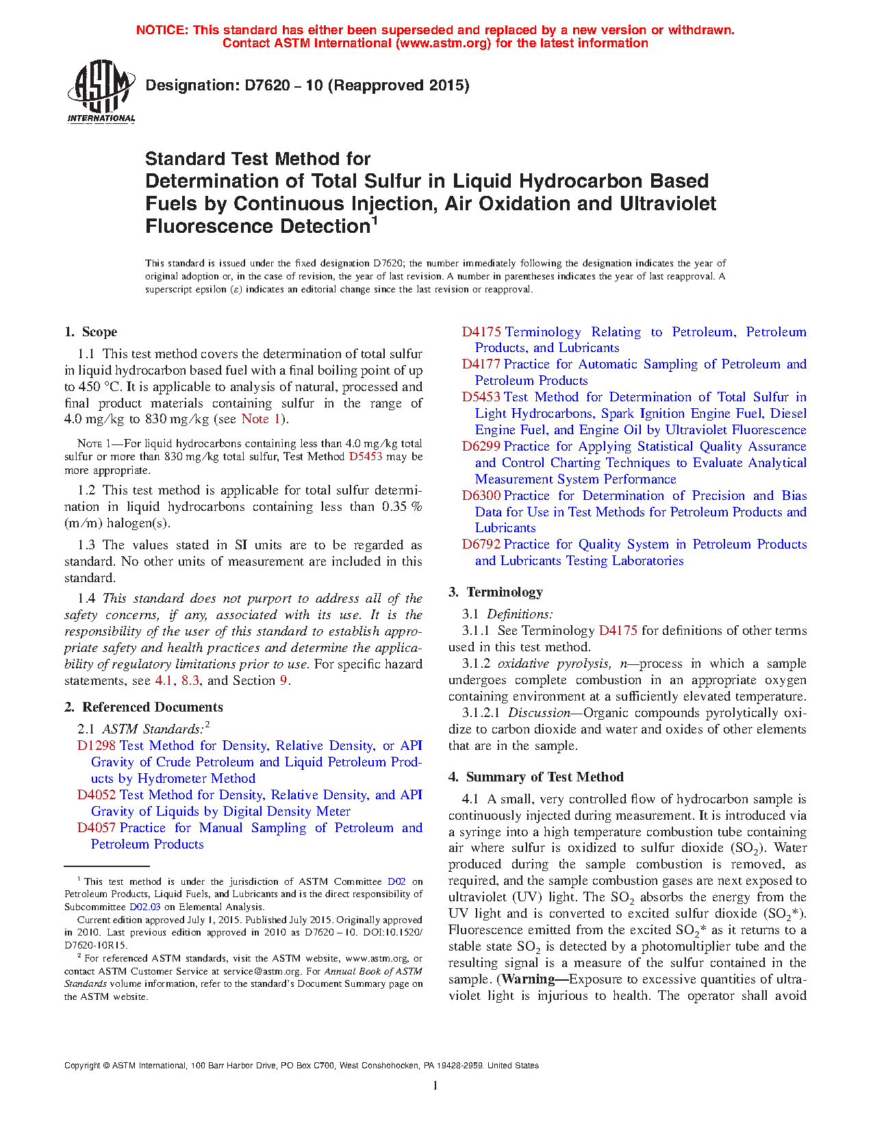 Note 1: For liquid hydrocarbons containing less than 4.0 mg/kg total sulfur or more than 830 mg/kg total sulfur, Test Method D5453 may be more appropriate.