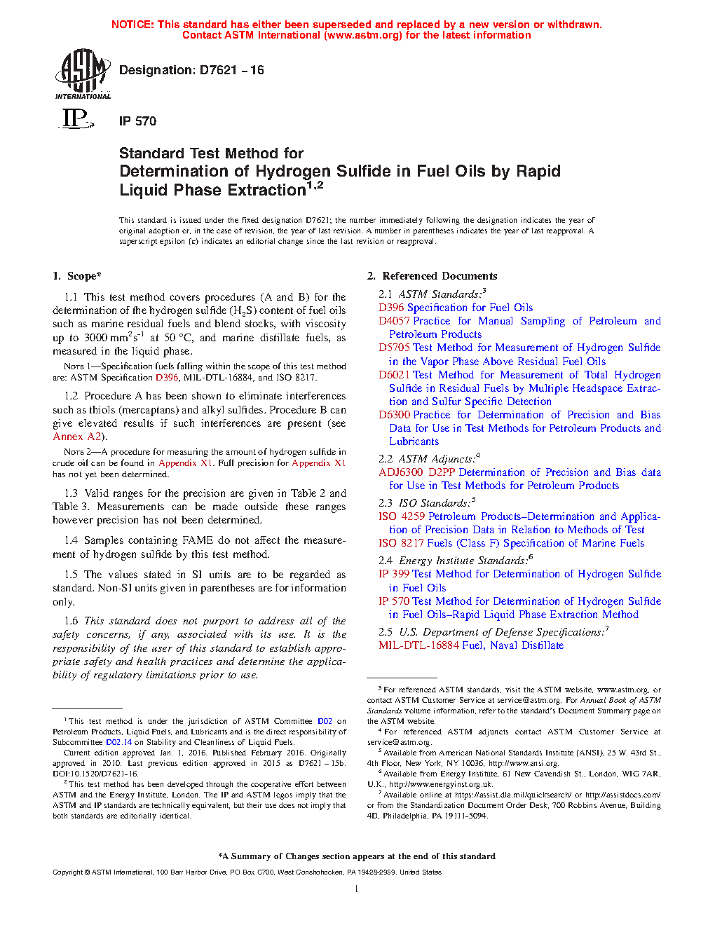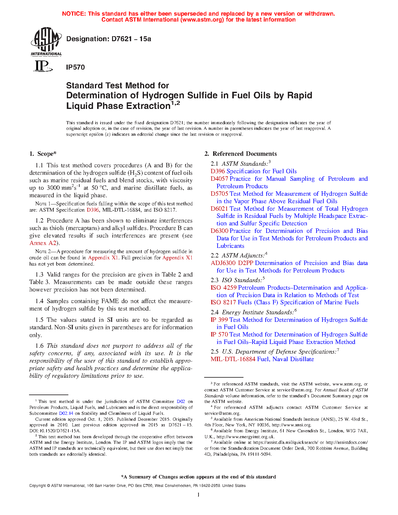 1.1 This test method covers procedures (A and B) for the determination of the hydrogen sulfide (H2S) content of fuel oils such as marine residual fuels and blend stocks, with viscosity up to 3000 mm2s-1 at 50°C, and marine distillate fuels, as measured in the liquid phase.