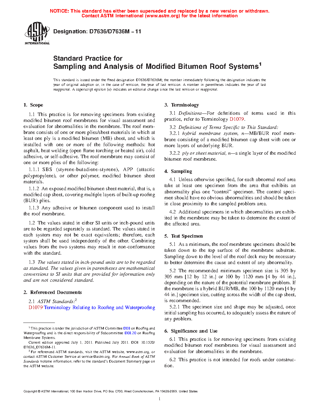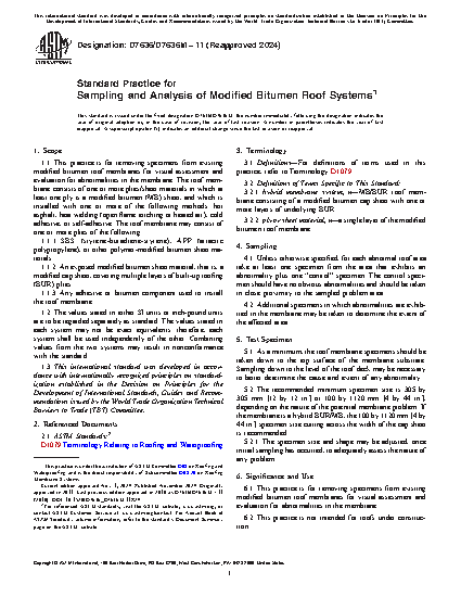 1.1 This practice is for removing specimens from existing modified bitumen roof membranes for visual assessment and evaluation for abnormalities in the membrane. The roof membrane consists of one or more plies/sheet materials in which at least one ply is a modified bitumen (MB) sheet, and which is installed with one or more of the following methods: hot asphalt, heat welding (open flame torching or heated air), cold adhesive, or self-adhesive. The roof membrane may consist of one or more plies of the following:
