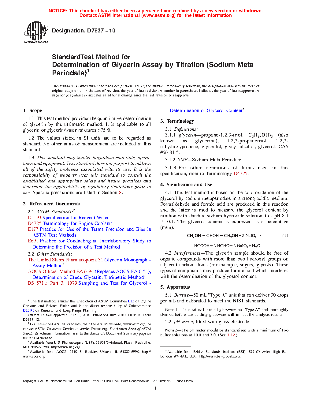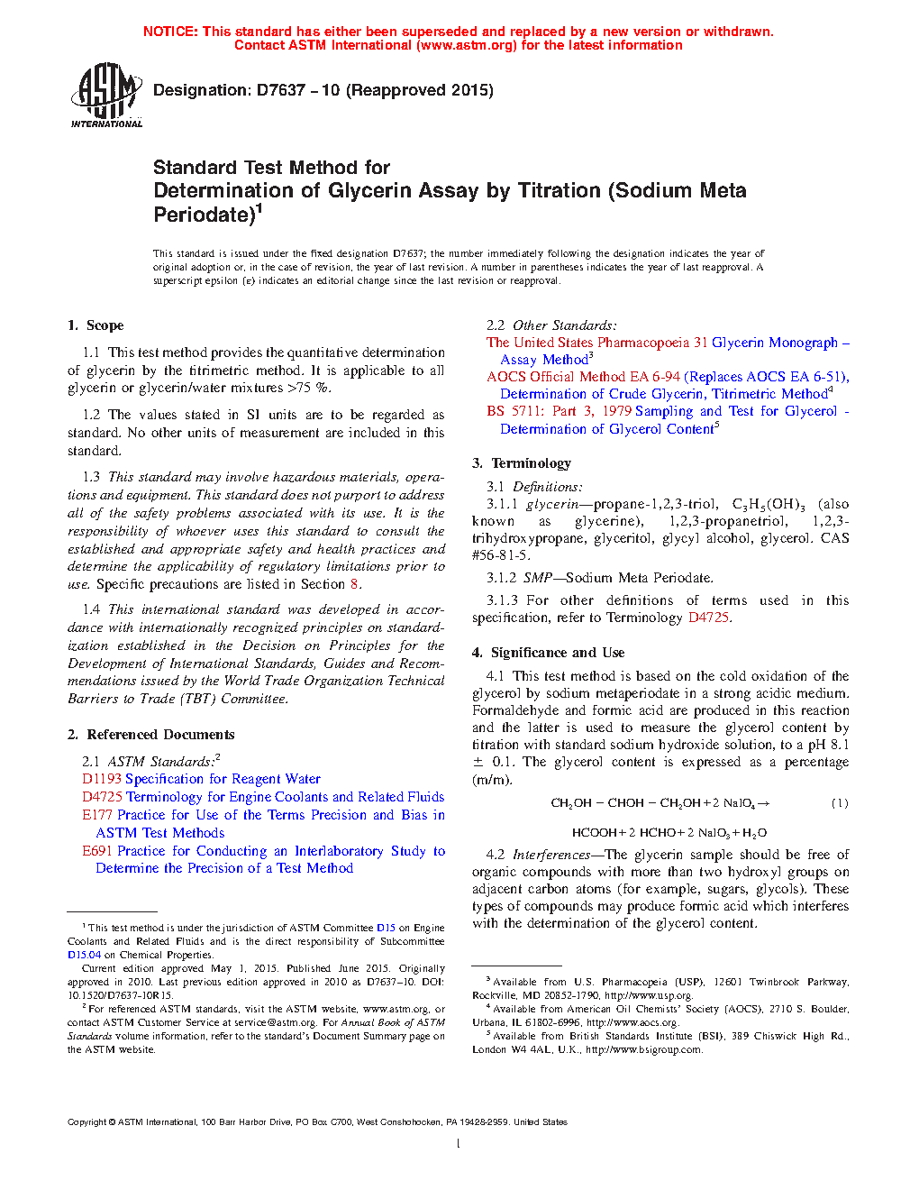 4.1 This test method is based on the cold oxidation of the glycerol by sodium metaperiodate in a strong acidic medium. Formaldehyde and formic acid are produced in this reaction and the latter is used to measure the glycerol content by titration with standard sodium hydroxide solution, to a pH 8.1 ± 0.1. The glycerol content is expressed as a percentage (m/m).