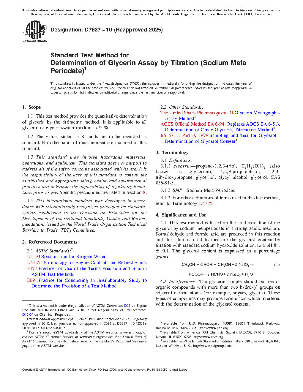 4.2 Interferences—The glycerin sample should be free of organic compounds with more than two hydroxyl groups on adjacent carbon atoms (for example, sugars, glycols). These types of compounds may produce formic acid which interferes with the determination of the glycerol content.