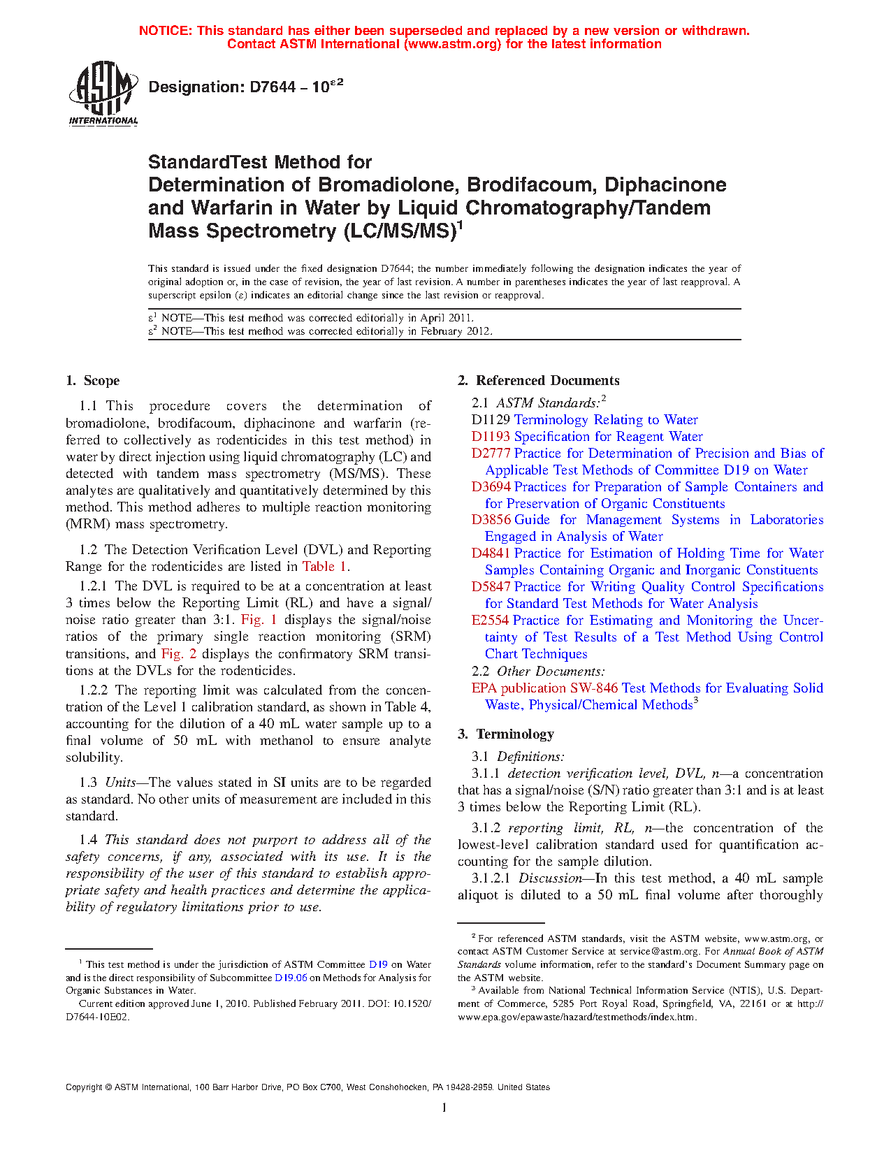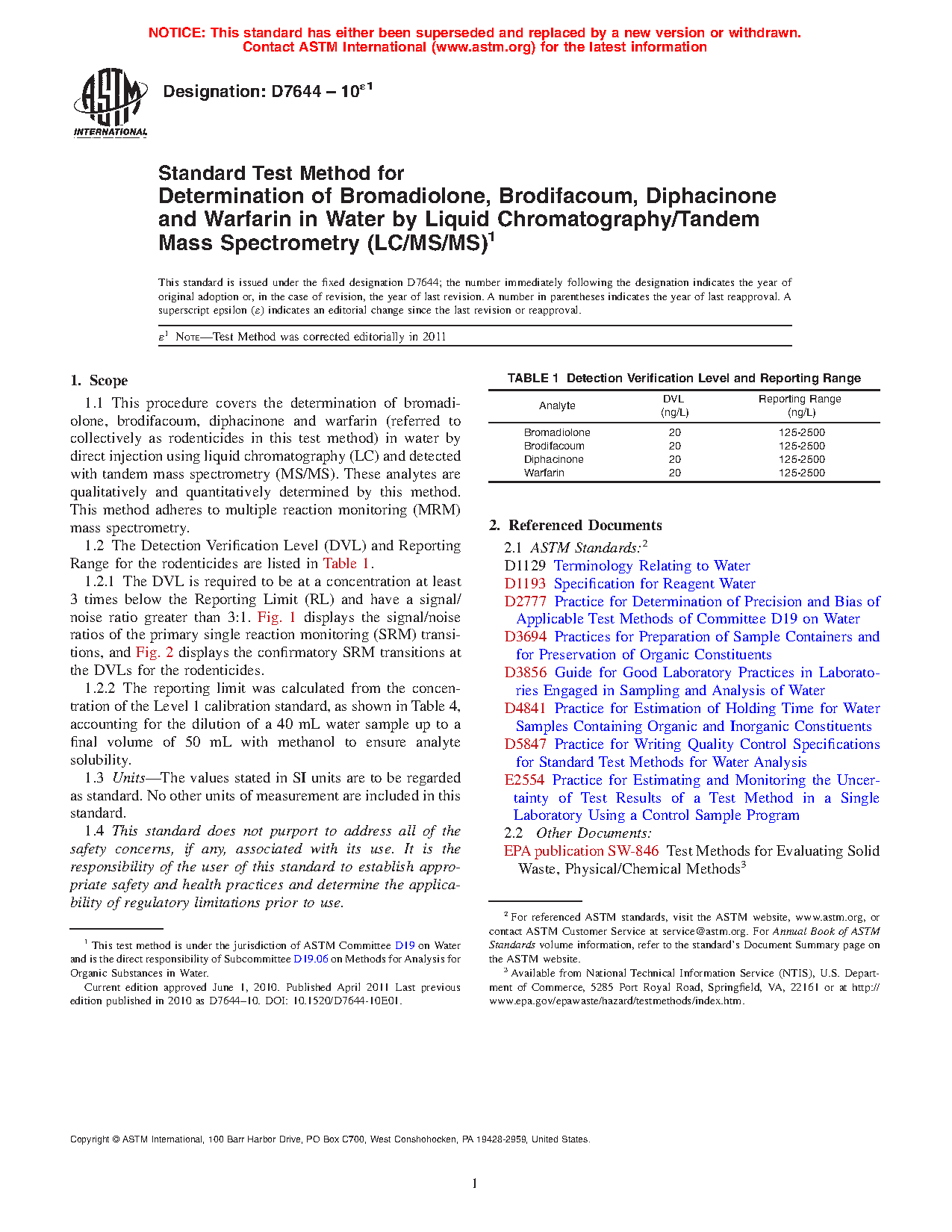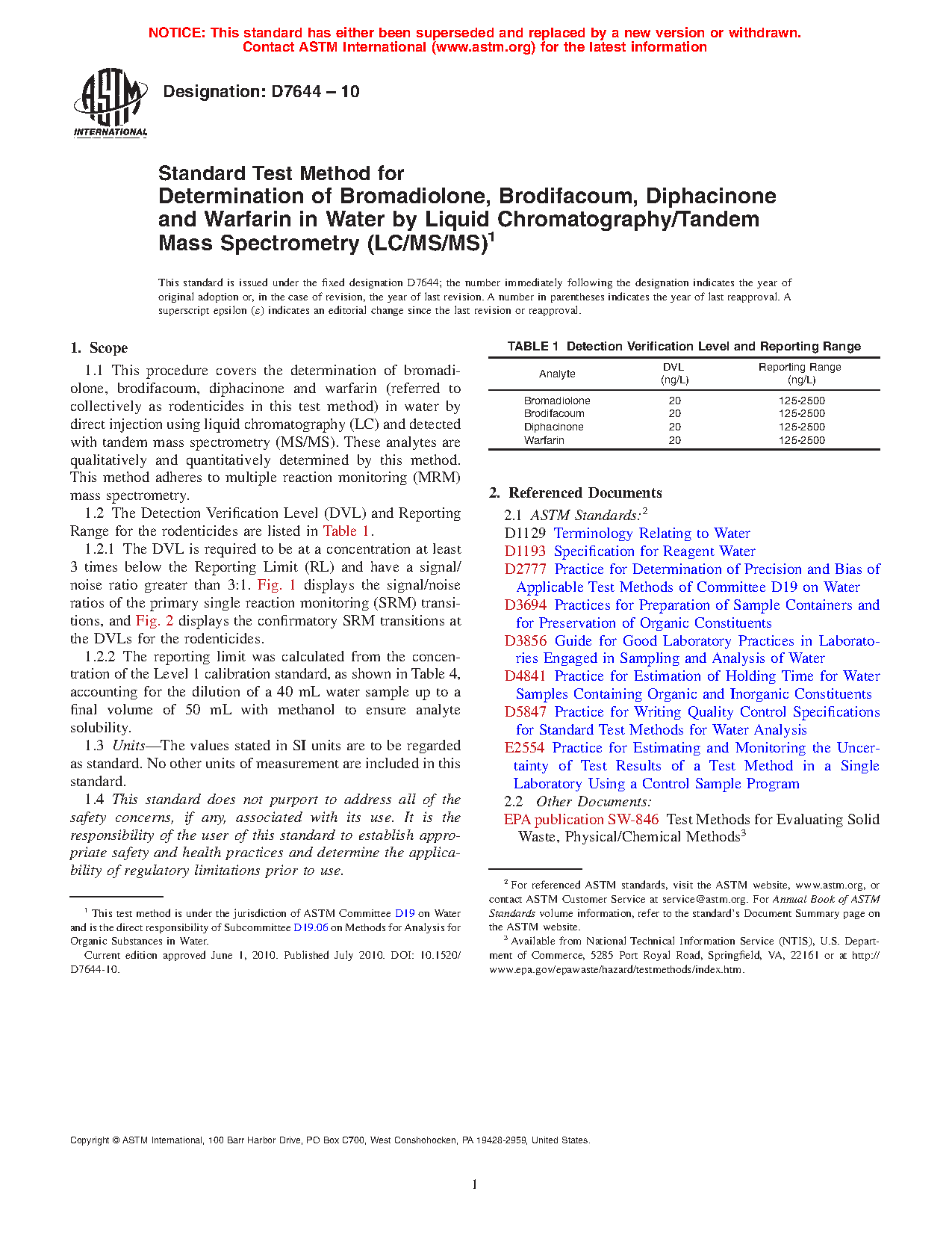 1.1 This procedure covers the determination of bromadiolone, brodifacoum, diphacinone and warfarin (referred to collectively as rodenticides in this test method) in water by direct injection using liquid chromatography (LC) and detected with tandem mass spectrometry (MS/MS). These analytes are qualitatively and quantitatively determined by this method. This method adheres to multiple reaction monitoring (MRM) mass spectrometry.