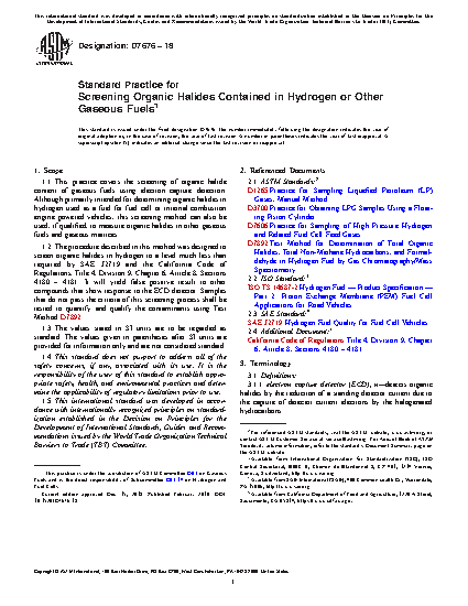 1.2 The procedure described in this method was designed to screen organic halides in hydrogen to a level much less than required by SAE J2719 and the California Code of Regulations, Title 4, Division 9, Chapter 6, Article 8, Sections 4180 – 4181. It will yield false positive result to other compounds that show response to the electron capture detector (ECD). Samples that do not pass the criteria of this screening process shall be tested to quantify and qualify the contaminants using Test Method D7892.