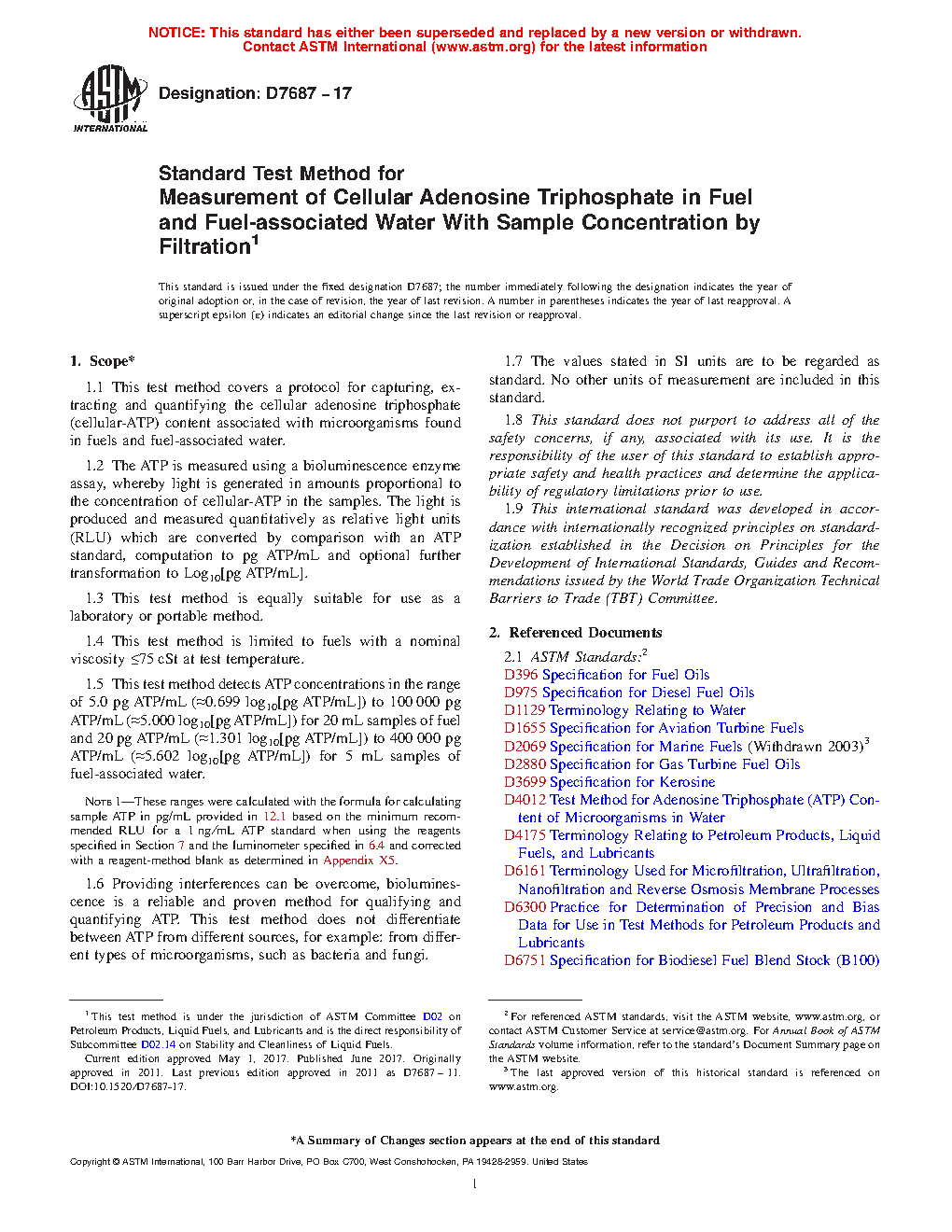 1.5 This test method detects ATP concentrations in the range of 5.0 pg ATP/mL (˜0.699 log10[pg ATP/mL]) to 100 000 pg ATP/mL (˜5.000 log10[pg ATP/mL]) for 20 mL samples of fuel and 20 pg ATP/mL (˜1.301 log10[pg ATP/mL]) to 400 000 pg ATP/mL (˜5.602 log10[pg ATP/mL]) for 5 mL samples of fuel-associated water.
