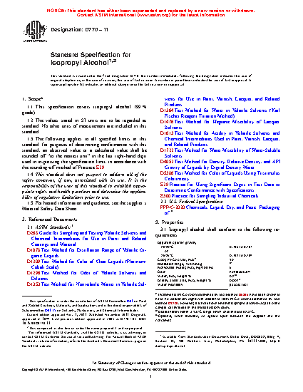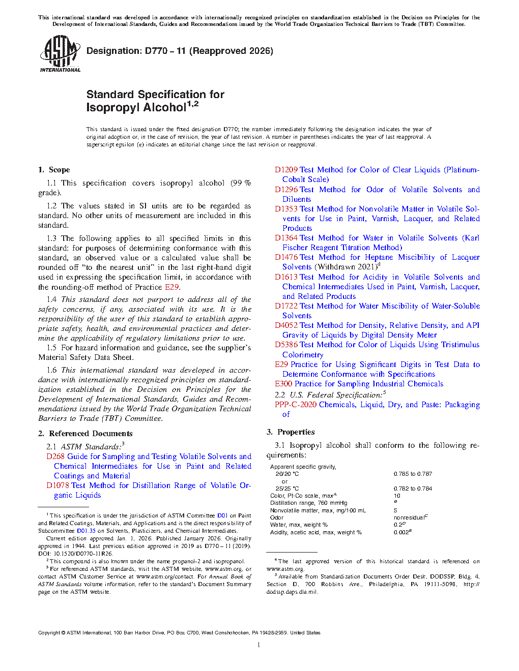 This specification covers the properties and requirements for isopropyl alcohol. Specimens shall be suitably sampled and tested, and shall adhere accordingly to specified values of the following properties: apparent specific gravity; color (Pt-Co scale); distillation range; nonvolatile matter content; odor; water content; acidity (acetic acid); and water miscibility.