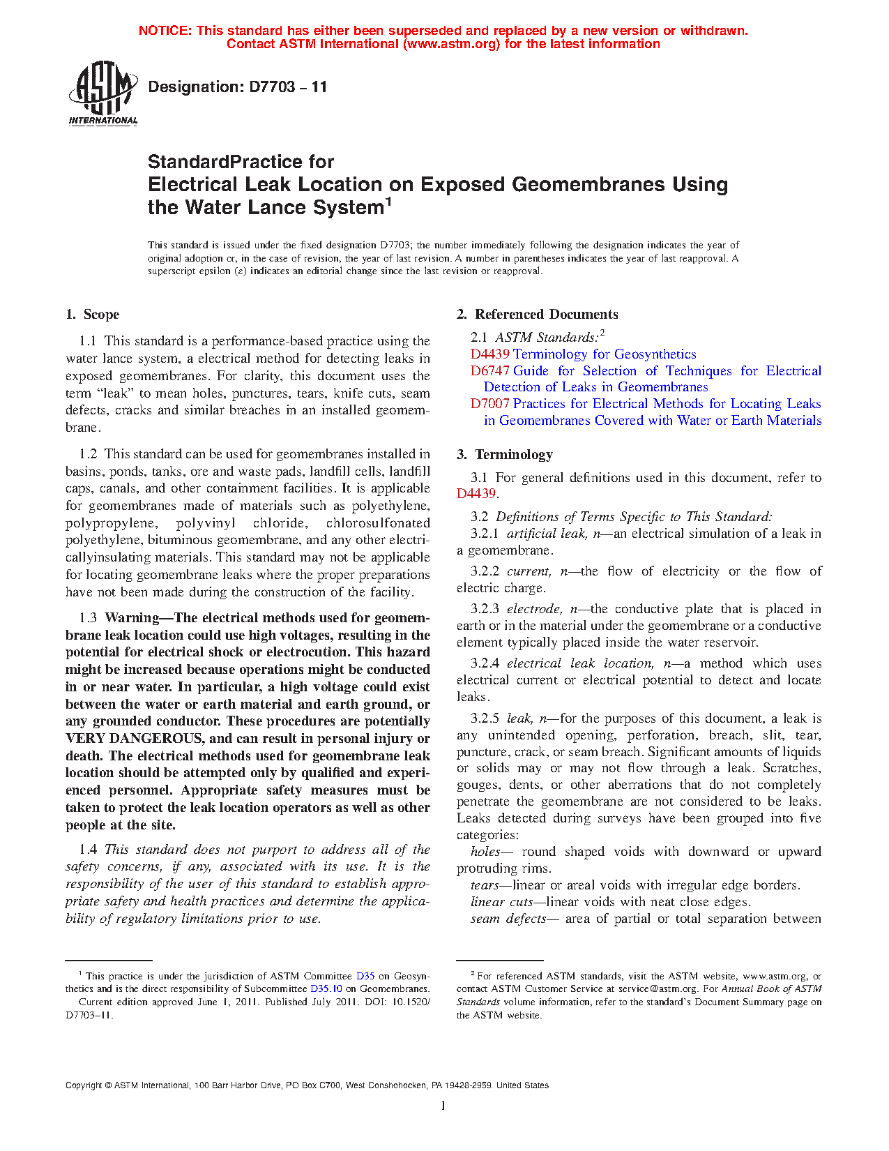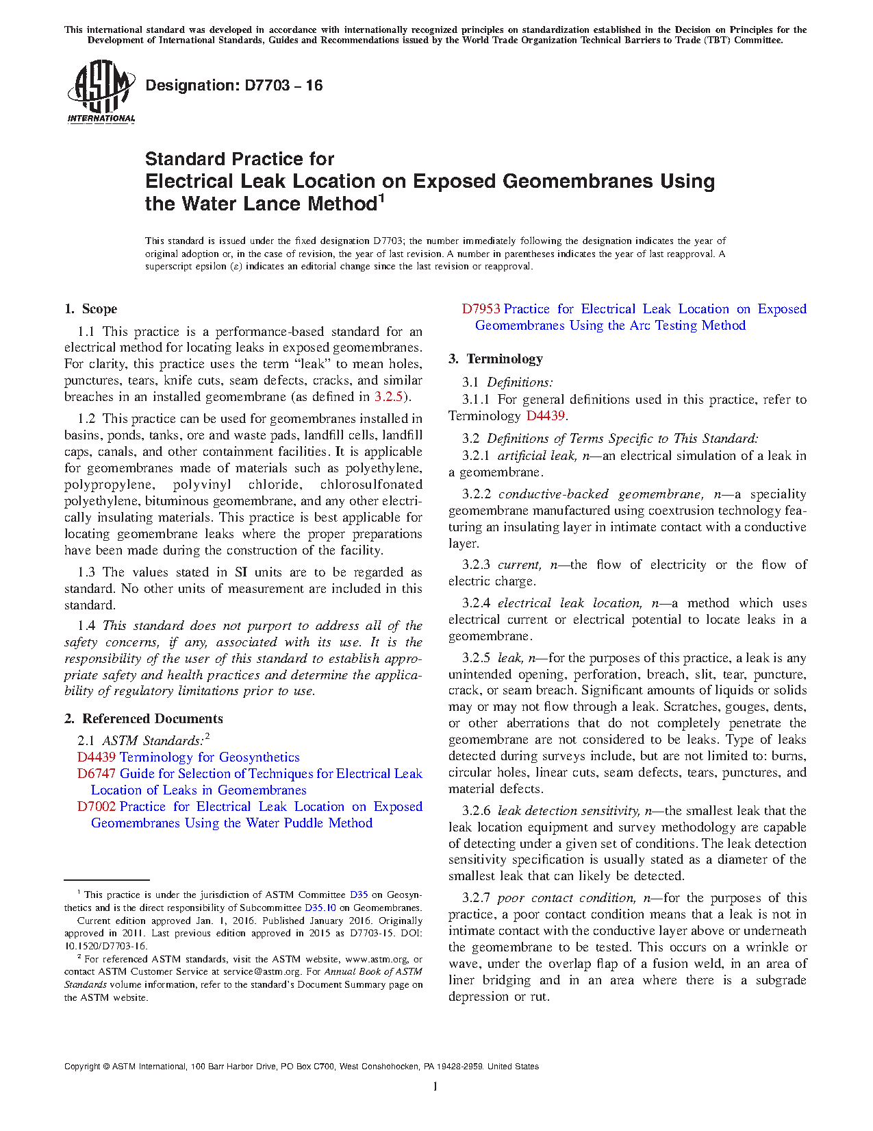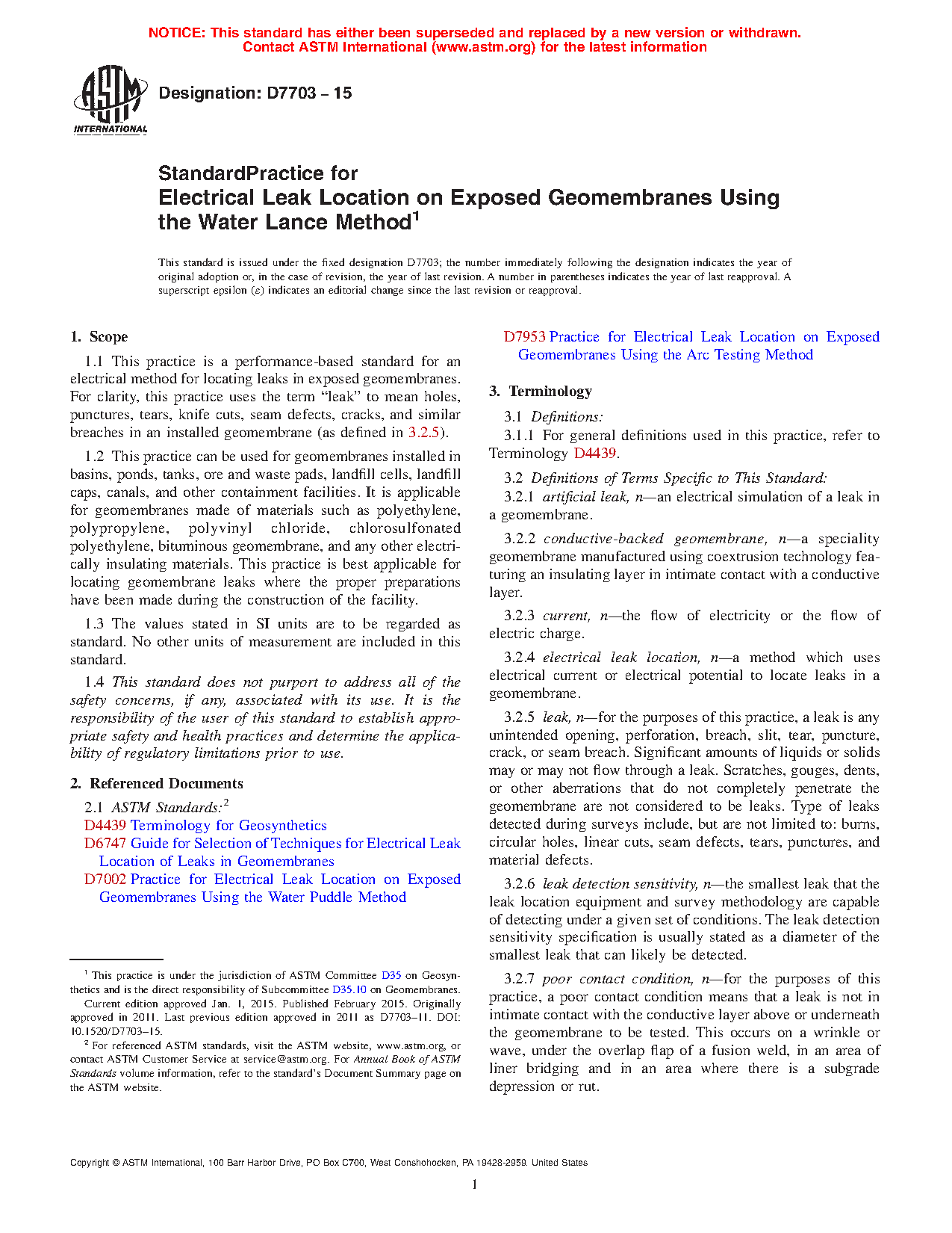 1.1 This practice is a performance-based standard for an electrical method for locating leaks in exposed geomembranes. For clarity, this practice uses the term “leak” to mean holes, punctures, tears, knife cuts, seam defects, cracks, and similar breaches in an installed geomembrane (as defined in 3.2.5).