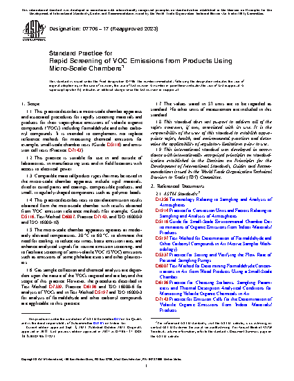 1.4 This practice describes tests to correlate emission results obtained from the micro-scale chamber with results obtained from VOC emission reference methods (for example, Guide D5116, Test Method D6007, Practice D7143, and ISO 16000-9 and ISO 16000-10).