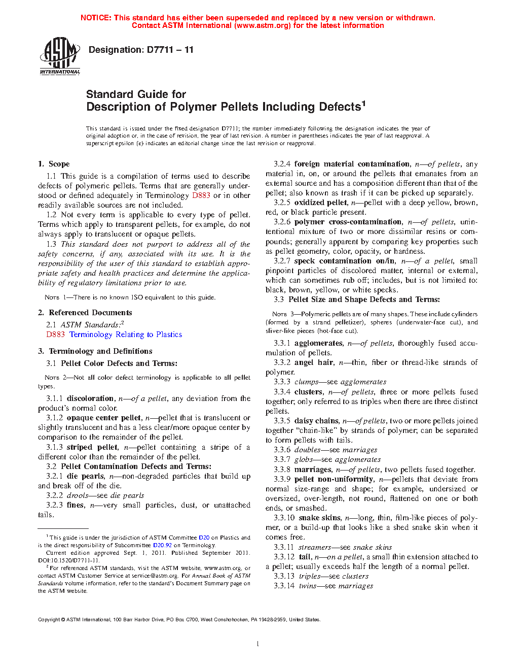 This guide is intended to provide terminology for both suppliers and users of polymer pellets to ensure mutual understanding in discussions concerning pellet defects. It is not an absolute standard but is to be referred to when issues with the quality and/or description of the polymeric materials arise.