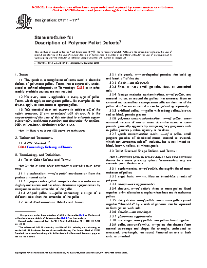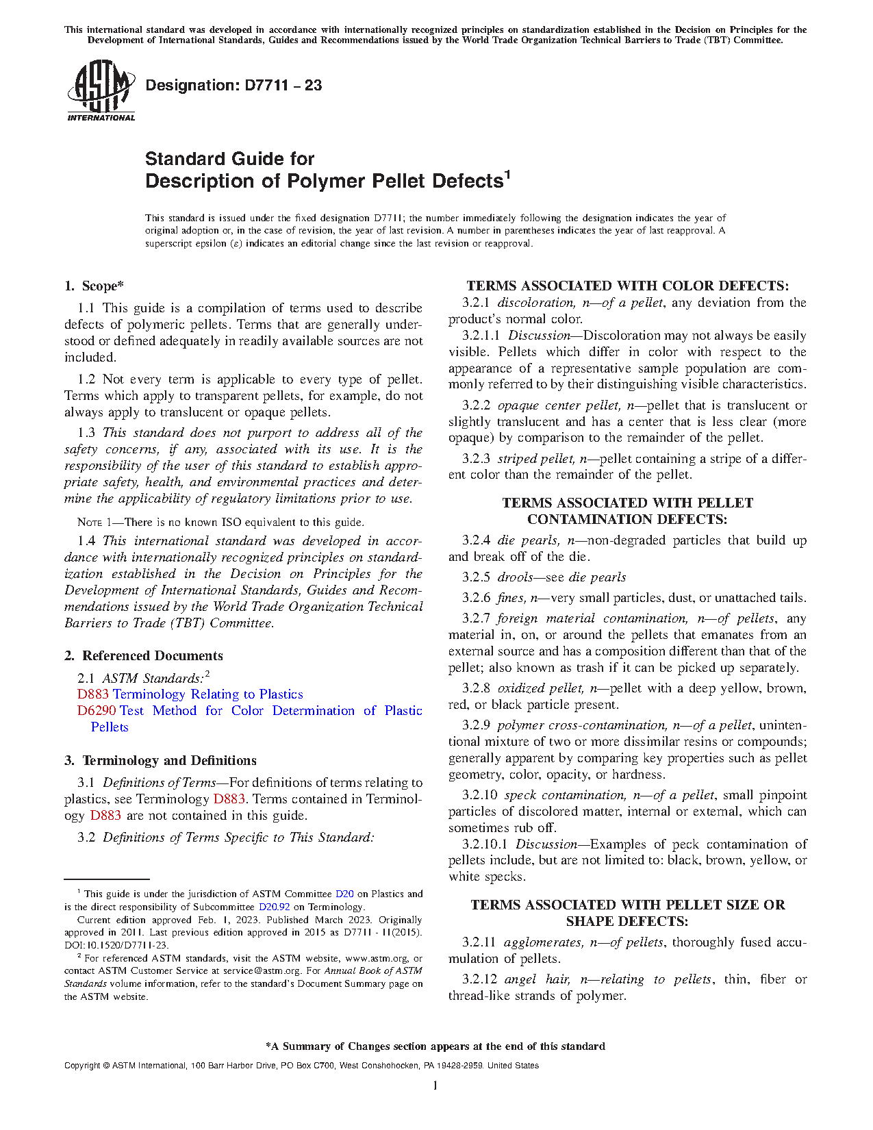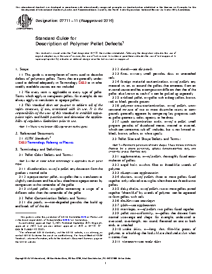 1.1 This guide is a compilation of terms used to describe defects of polymeric pellets. Terms that are generally understood or defined adequately in readily available sources are not included.