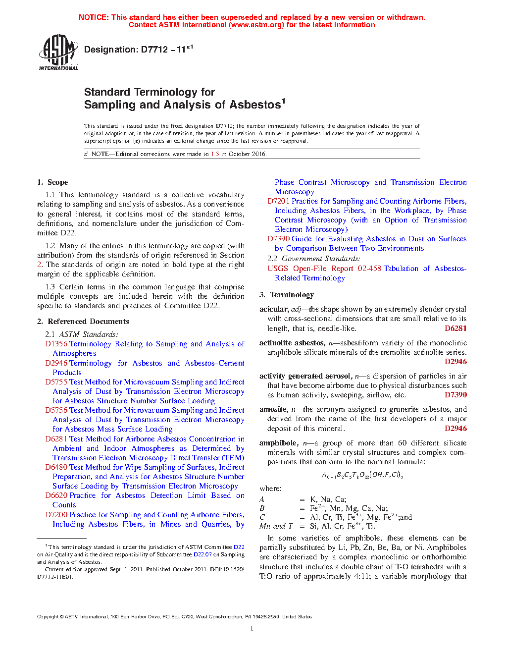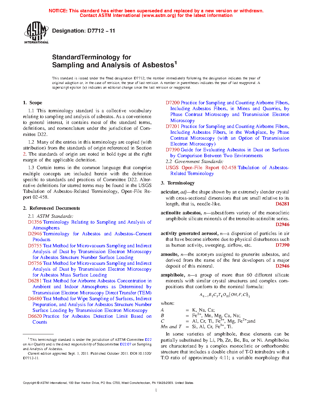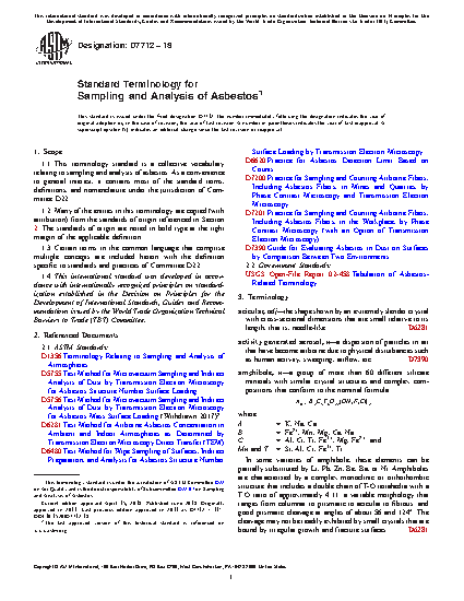 1.1 This terminology standard is a collective vocabulary relating to sampling and analysis of asbestos. As a convenience to general interest, it contains most of the standard terms, definitions, and nomenclature under the jurisdiction of Committee D22.