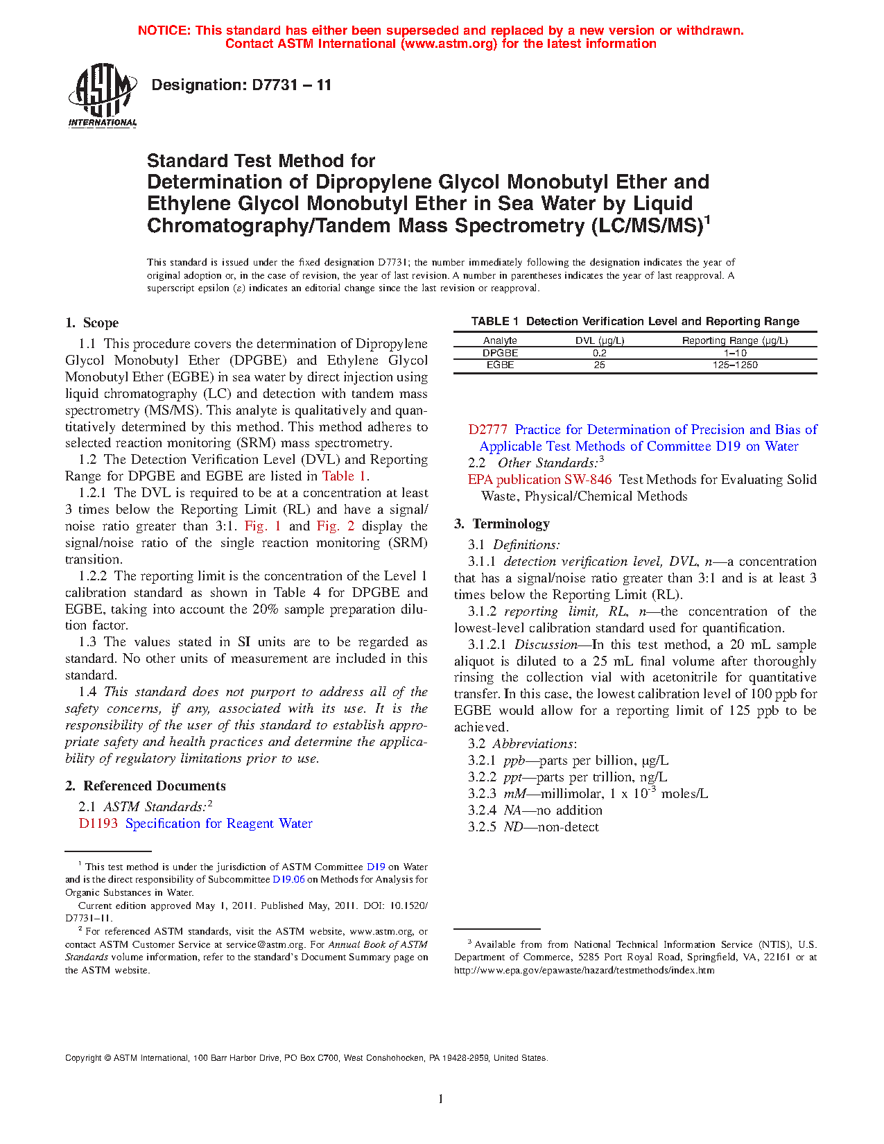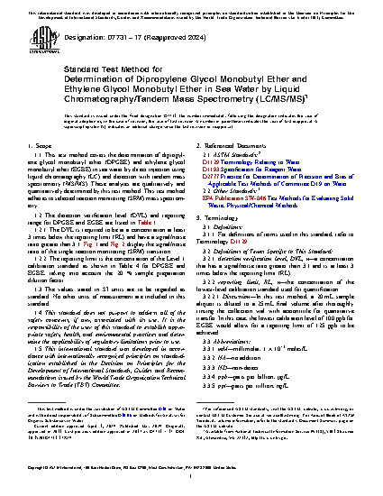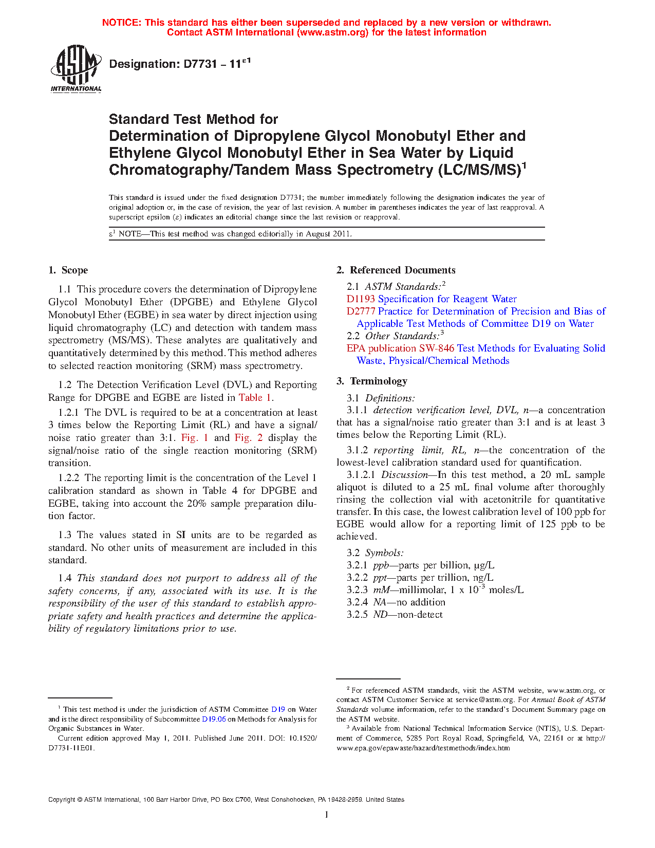 1.1 This procedure covers the determination of Dipropylene Glycol Monobutyl Ether (DPGBE) and Ethylene Glycol Monobutyl Ether (EGBE) in sea water by direct injection using liquid chromatography (LC) and detection with tandem mass spectrometry (MS/MS). This analyte is qualitatively and quantitatively determined by this method. This method adheres to selected reaction monitoring (SRM) mass spectrometry.