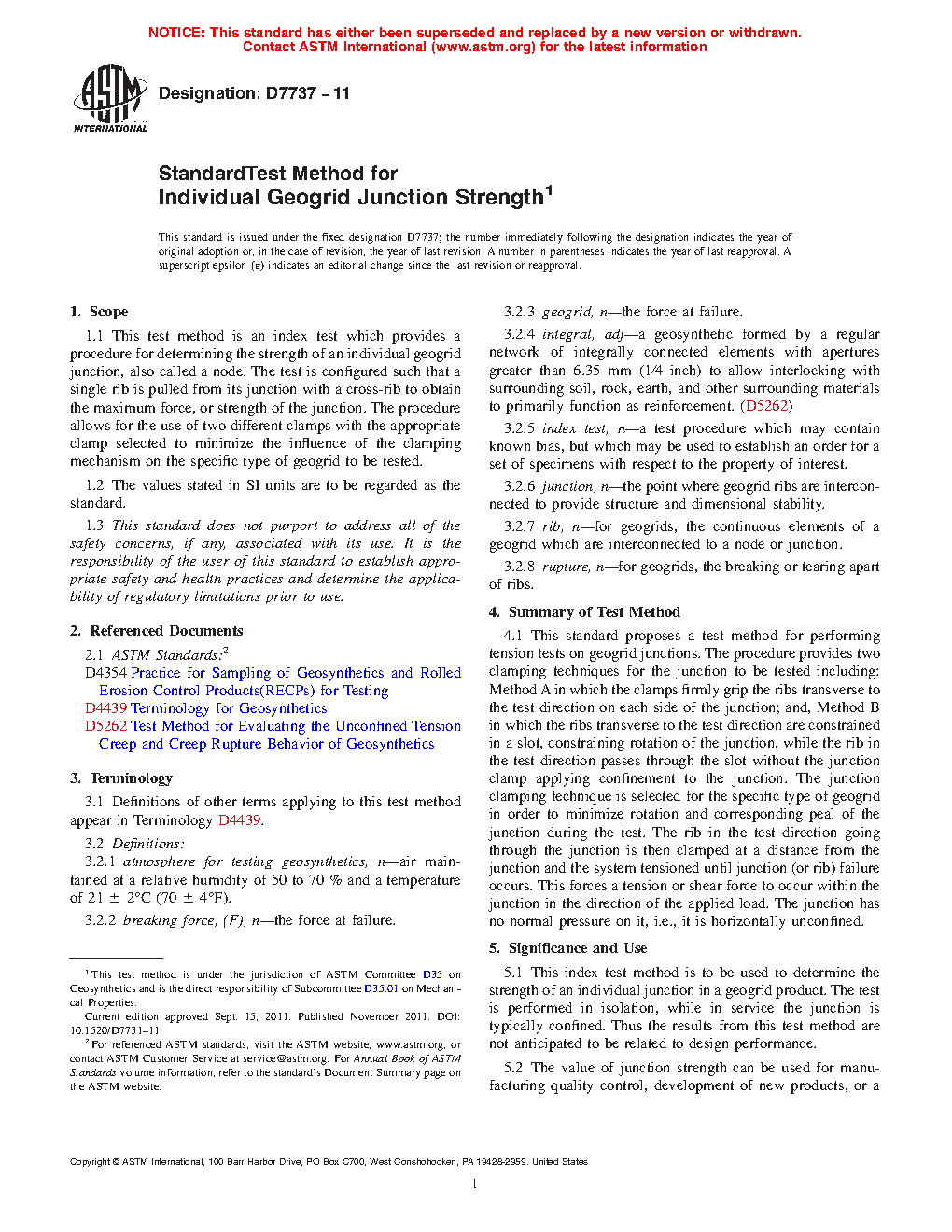 1.1 This test method is an index test which provides a procedure for determining the strength of an individual geogrid junction, also called a node. The test is configured such that a single rib is pulled from its junction with a cross-rib to obtain the maximum force, or strength of the junction. The procedure allows for the use of two different clamps with the appropriate clamp selected to minimize the influence of the clamping mechanism on the specific type of geogrid to be tested.
