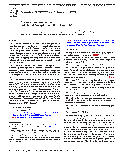 1.1 This test method is an index test which provides a procedure for determining the strength of an individual geogrid junction, also called a node. The test is configured such that a single rib is pulled from its junction with a rib(s) transverse to the test direction to obtain the maximum force, or strength of the junction. The procedure allows for the use of two different clamps with the appropriate clamp selected to minimize the influence of the clamping mechanism on the specific type of geogrid to be tested.