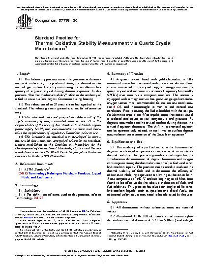 1.1 This laboratory practice covers the quantitative determination of surface deposits produced during the thermal oxidation of gas turbine fuels by monitoring the oscillation frequency of a quartz crystal during thermal exposure. In this practice, “thermal oxidative stability” refers to the tendency of a fuel to resist surface deposit formation during heating.