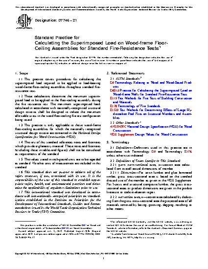 4.2 This practice describes procedures for calculating the superimposed load to be applied in standard fire resistance tests of wood floor-ceiling assemblies. Practice D6513 provides a similar methodology for calculating the superimposed load on wood-frame walls.