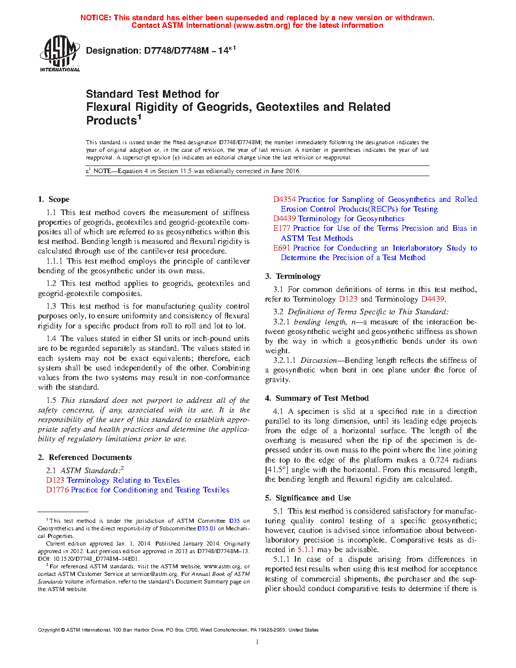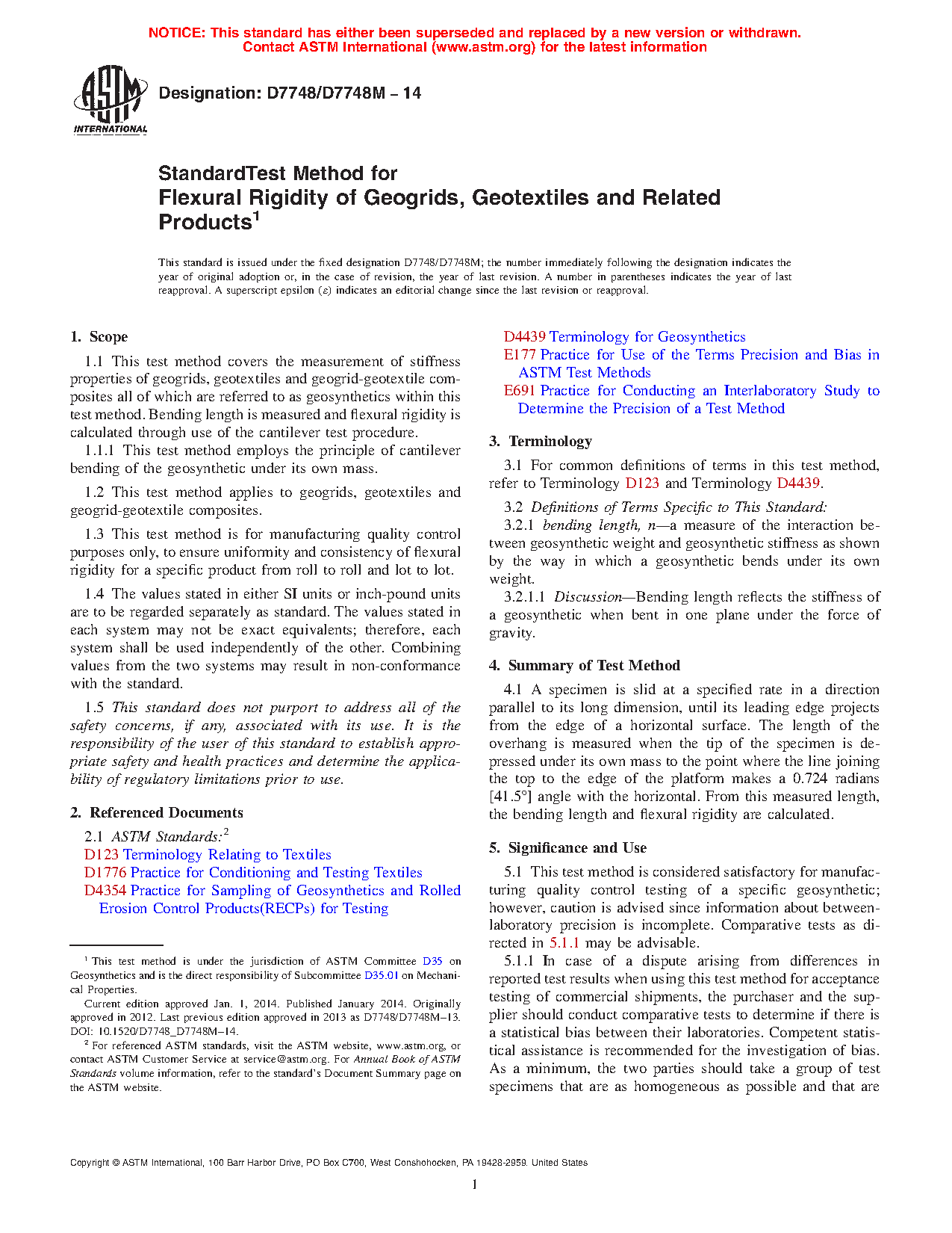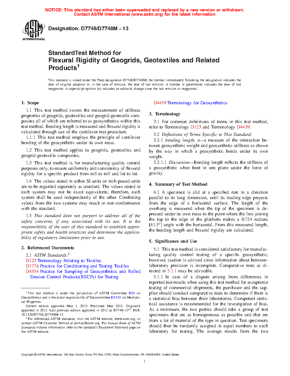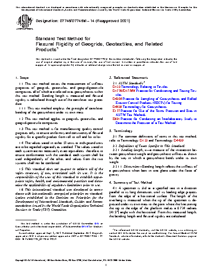 1.1 This test method covers the measurement of stiffness properties of geogrids, geotextiles and geogrid-geotextile composites all of which are referred to as geosynthetics within this test method. Bending length is measured and flexural rigidity is calculated through use of the cantilever test procedure.
