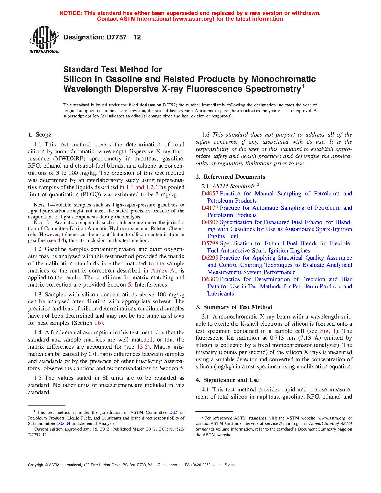 This test method provides rapid and precise measurement of total silicon in naphthas, gasoline, RFG, ethanol and ethanol-fuel blends, and toluene with minimum sample preparation. Typical analysis time is 5 to 10 min per sample.