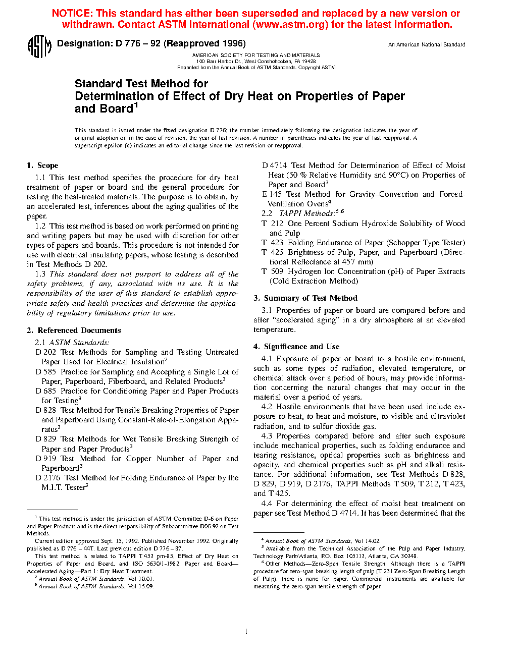 Properties compared before and after such exposure include mechanical properties, such as folding endurance and tearing resistance, optical properties such as brightness and opacity, and chemical properties such as pH and alkali resistance. For additional information, see Test Methods D 828, D 829, D 919, D 2176