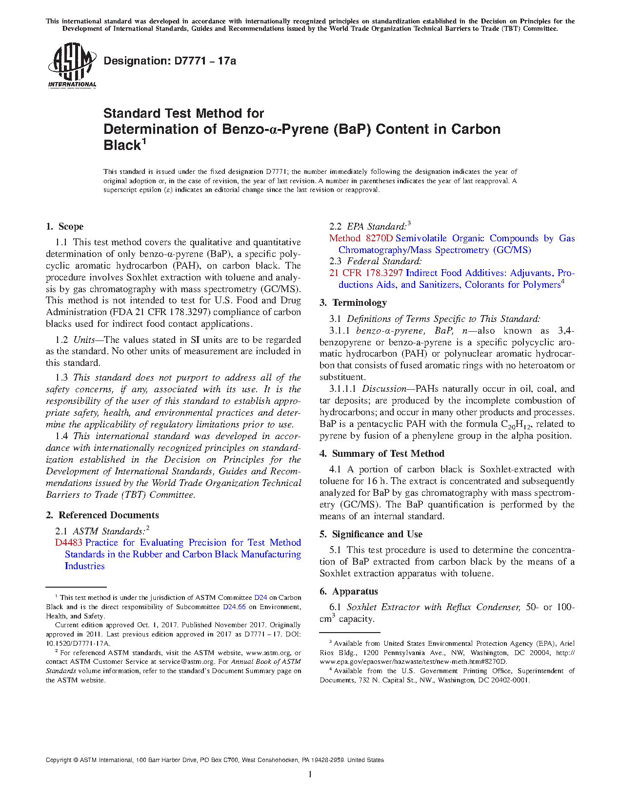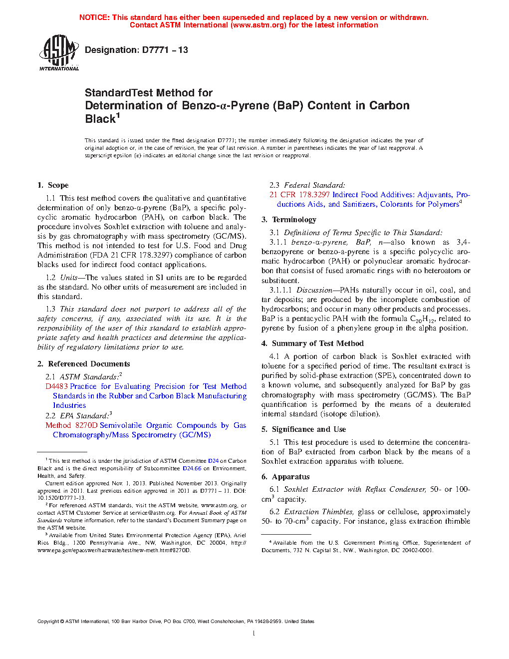 1.1 This test method covers the qualitative and quantitative determination of only benzo-α-pyrene (BaP), a specific polycyclic aromatic hydrocarbon (PAH), on carbon black. The procedure involves Soxhlet extraction with toluene and analysis by gas chromatography with mass spectrometry (GC/MS). This method is not intended to test for U.S. Food and Drug Administration (FDA) compliance of carbon blacks used for indirect food contact applications.
