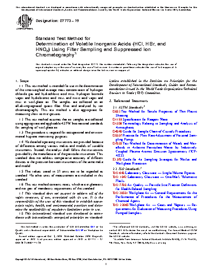 1.1 This test method is intended for use in the determination of the time-weighted average mass concentration of hydrogen chloride gas and hydrochloric acid mist, hydrogen bromide vapor and hydrobromic acid mist, and nitric acid vapor and mist in workplace air. The samples are collected on an alkali-impregnated quartz fiber filter and analyzed by ion chromatography. This test method is also appropriate for measuring short term exposures.