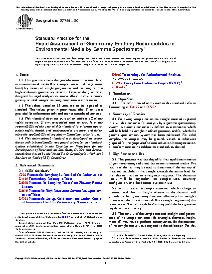 1.1 This practice covers the quantification of radionuclides in environmental media (e.g., water, soil, vegetation, food) by means of simple preparation and counting with a high-resolution gamma ray detector. Because the practice is designed for rapid analysis, extensive efforts to ensure homogeneity or ideal sample counting conditions are not taken.