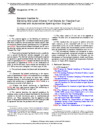 1.1 This practice applies to the blending of automotive spark-ignition engine fuels with ethanol concentrations greater than those suitable for conventional-fuel vehicles and less than the minimum ethanol content specification limits of Specification D5798. These mid-level ethanol fuel blends are for use in flexible-fuel vehicles and are sometimes referred to at retail as “Ethanol Flex Fuel.”