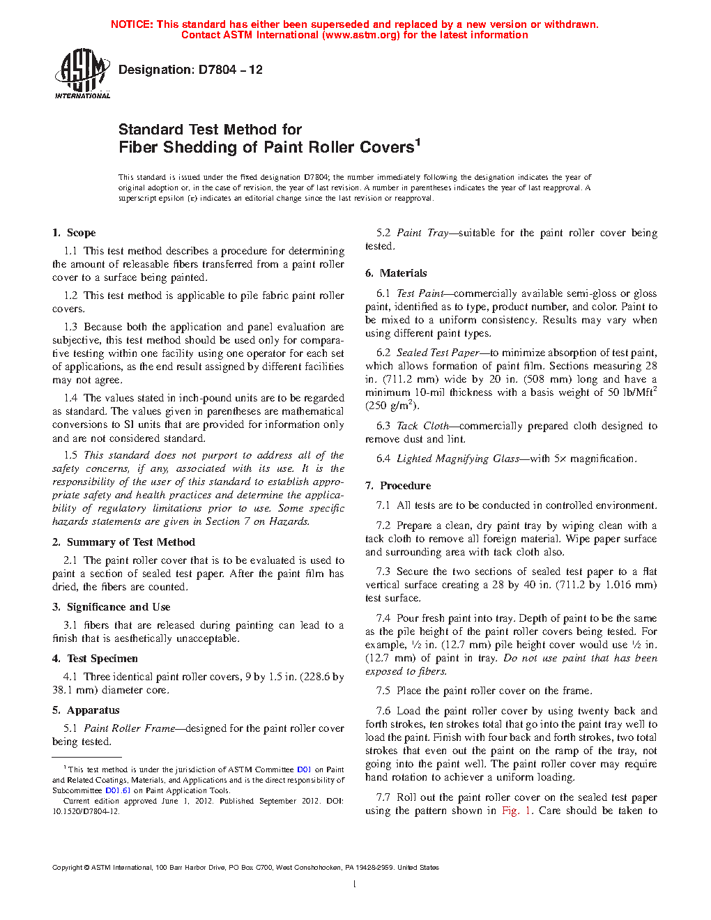 1.1 This test method describes a procedure for determining the amount of releasable fibers transferred from a paint roller cover to a surface being painted.