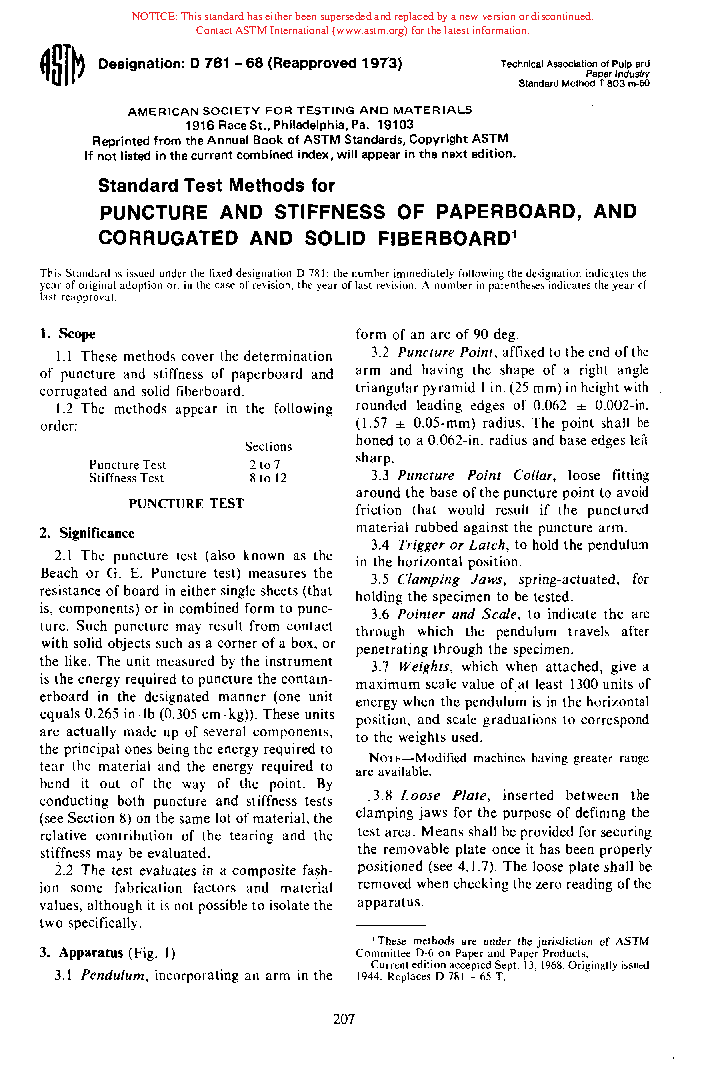 Method of Test for Puncture and Stiffness of Paperboard, Corrugated and Solid Fiberboard (Withdrawn 1984)