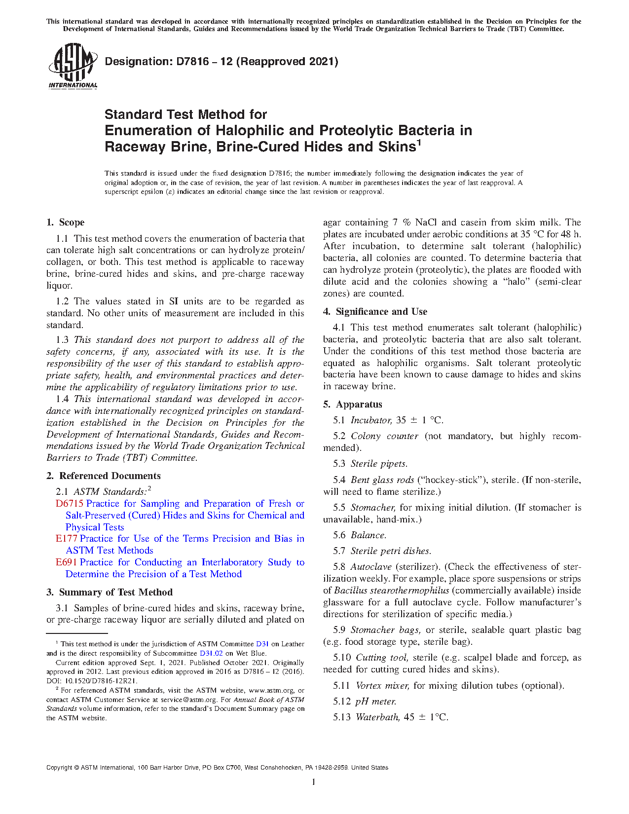 1.1 This test method covers the enumeration of bacteria that can tolerate high salt concentrations or can hydrolyze protein/collagen, or both. This test method is applicable to raceway brine, brine-cured hides and skins, and pre-charge raceway liquor.