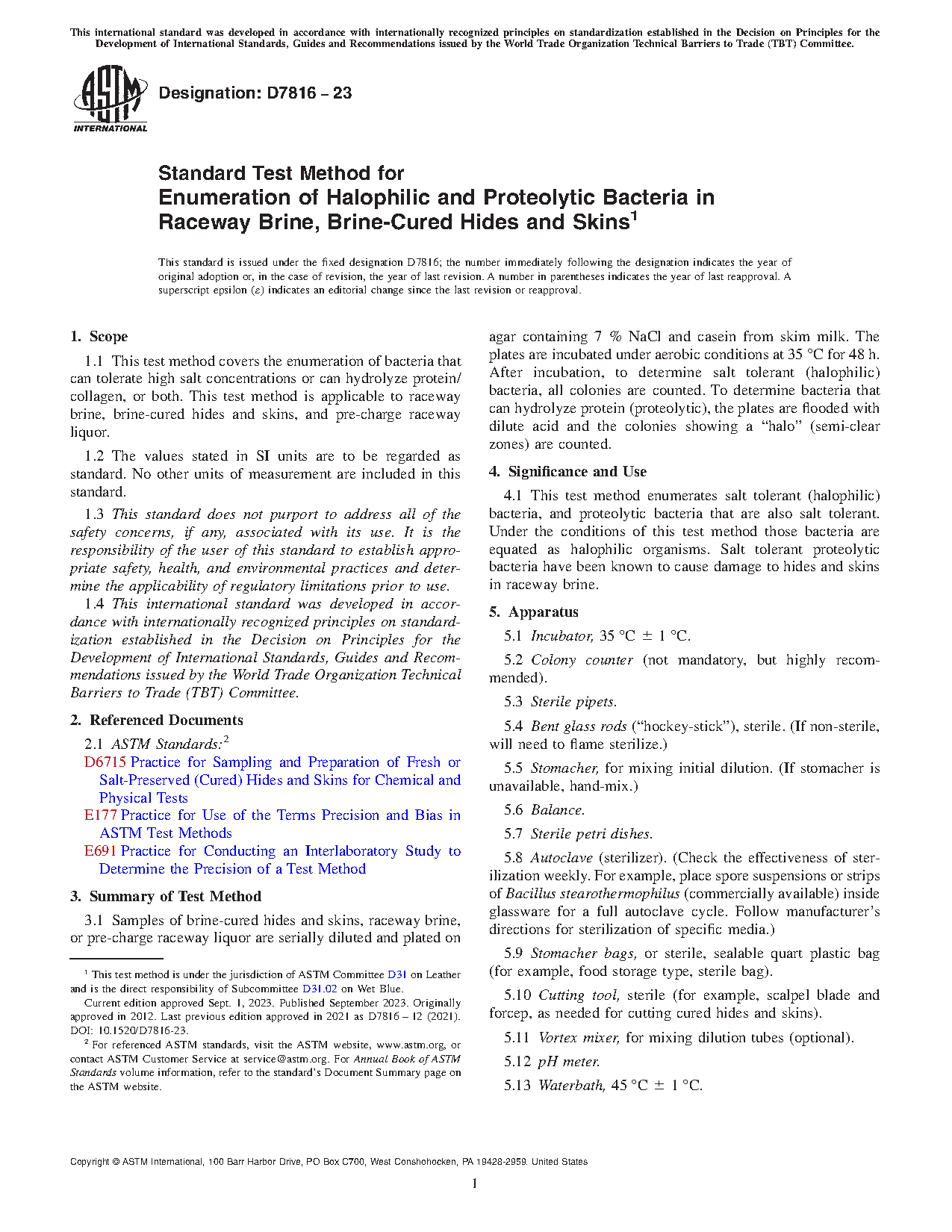4.1 This test method enumerates salt tolerant (halophilic) bacteria, and proteolytic bacteria that are also salt tolerant. Under the conditions of this test method those bacteria are equated as halophilic organisms. Salt tolerant proteolytic bacteria have been known to cause damage to hides and skins in raceway brine.